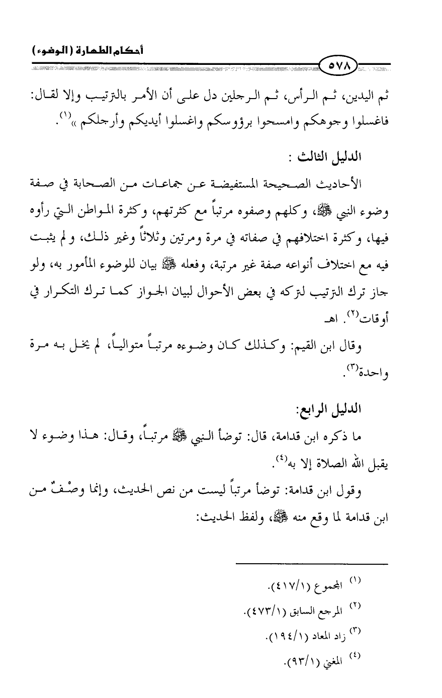 ما ذكره ابن قدامة، قال: توضأ النبي - صلى الله عليه وسلم - مرتباً، وقال: هذا وضوء لا يقبل الله الصلاة إلا به (¬4).