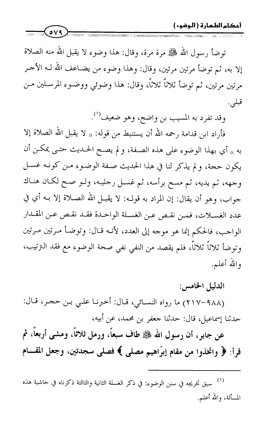 فأراد ابن قدامة رحمه الله أن يستنبط من قوله: «لا يقبل الله الصلاة إلا به» أي بهذا الوضوء على هذه الصفة، ولم يصح الحديث حتى يمكن أن يكون حجة، ولم يذكر لنا في هذا الحديث صفة الوضوء من كونه غسل وجهه، ثم يديه، ثم مسح برأسه، ثم غسل رجليه، ولو صح لكان هناك جواب، وهو أن يقال: إن المراد به قوله: لا يقبل الله الصلاة إلا به أي في عدد الغسلات، فمن نقص عن الغسلة الواحدة فقد نقص عن المقدار الواجب، فالحكم إنما هو موجه إلى العدد، لأنه قال: وتوضأ مرتين مرتين وتوضأ ثلاثاً ثلاثاً، فلم يقصد من النفي نفي صحة الوضوء مع فقد الترتيب، والله أعلم.