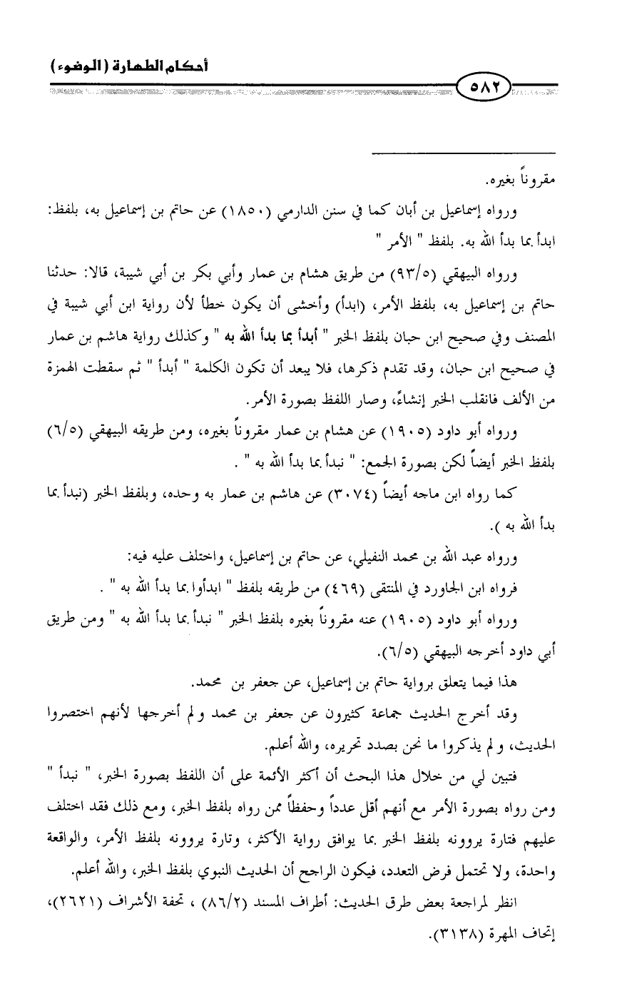 ورواه البيهقي (5/ 93) من طريق هشام بن عمار وأبي بكر بن أبي شيبة، قالا: حدثنا حاتم بن إسماعيل به، بلفظ الأمر، (ابدأ) وأخشى أن يكون خطأ لأن رواية ابن أبي شيبة في المصنف وفي صحيح ابن حبان بلفظ الخبر " أبدأ بما بدأ الله به " وكذلك رواية هاشم بن عمار في صحيح ابن حبان، وقد تقدم ذكرها، فلا يبعد أن تكون الكلمة " أبدأ " ثم سقطت الهمزة من الألف فانقلب الخبر إنشاءً، وصار اللفظ بصورة الأمر.