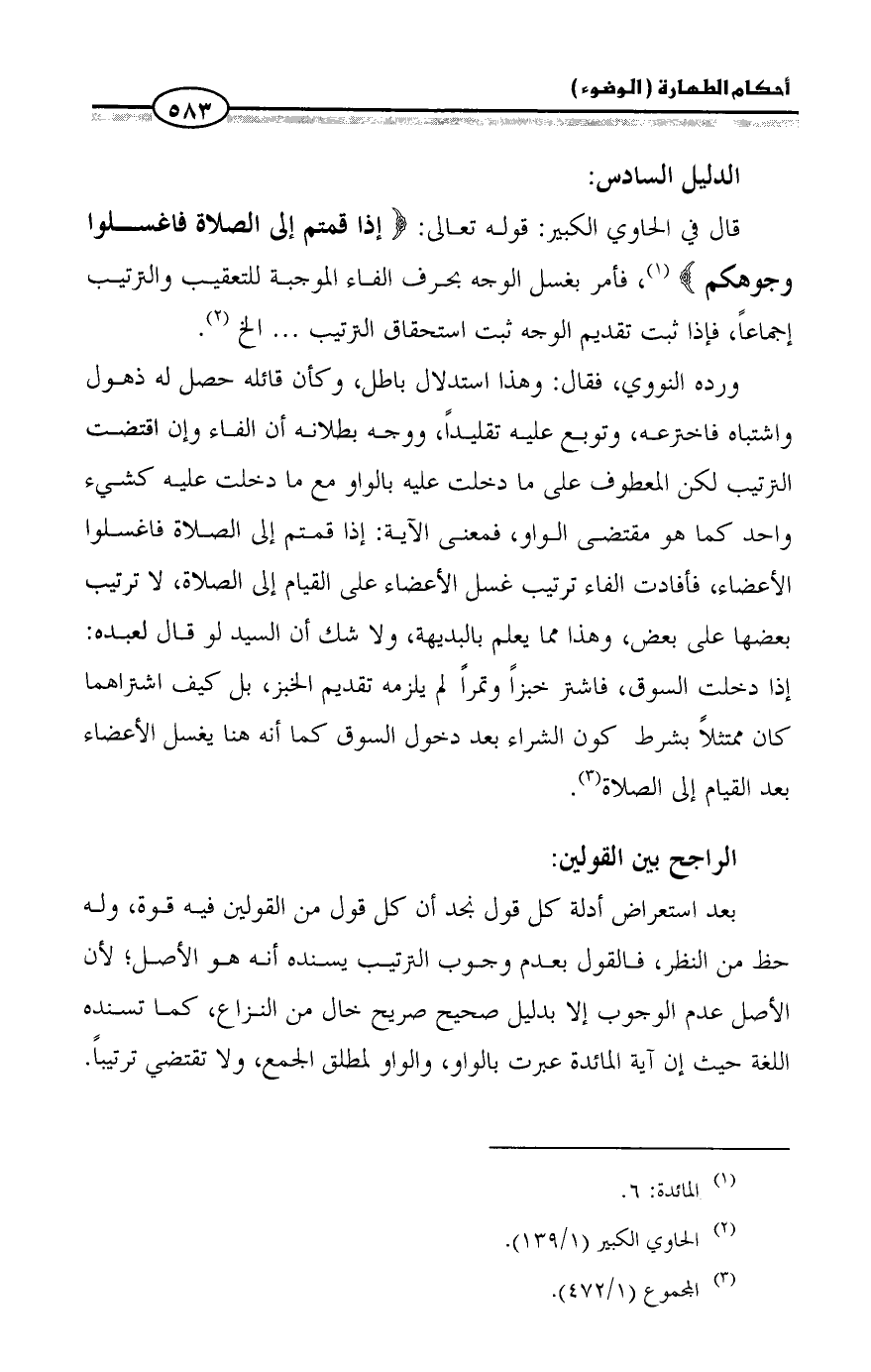 قال في الحاوي الكبير: قوله تعالى: {إذا قمتم إلى الصلاة فاغسلوا وجوهكم} (¬1)، فأمر بغسل الوجه بحرف الفاء الموجبة للتعقيب والترتيب إجماعاً، فإذا ثبت تقديم الوجه ثبت استحقاق الترتيب ... الخ (¬2).