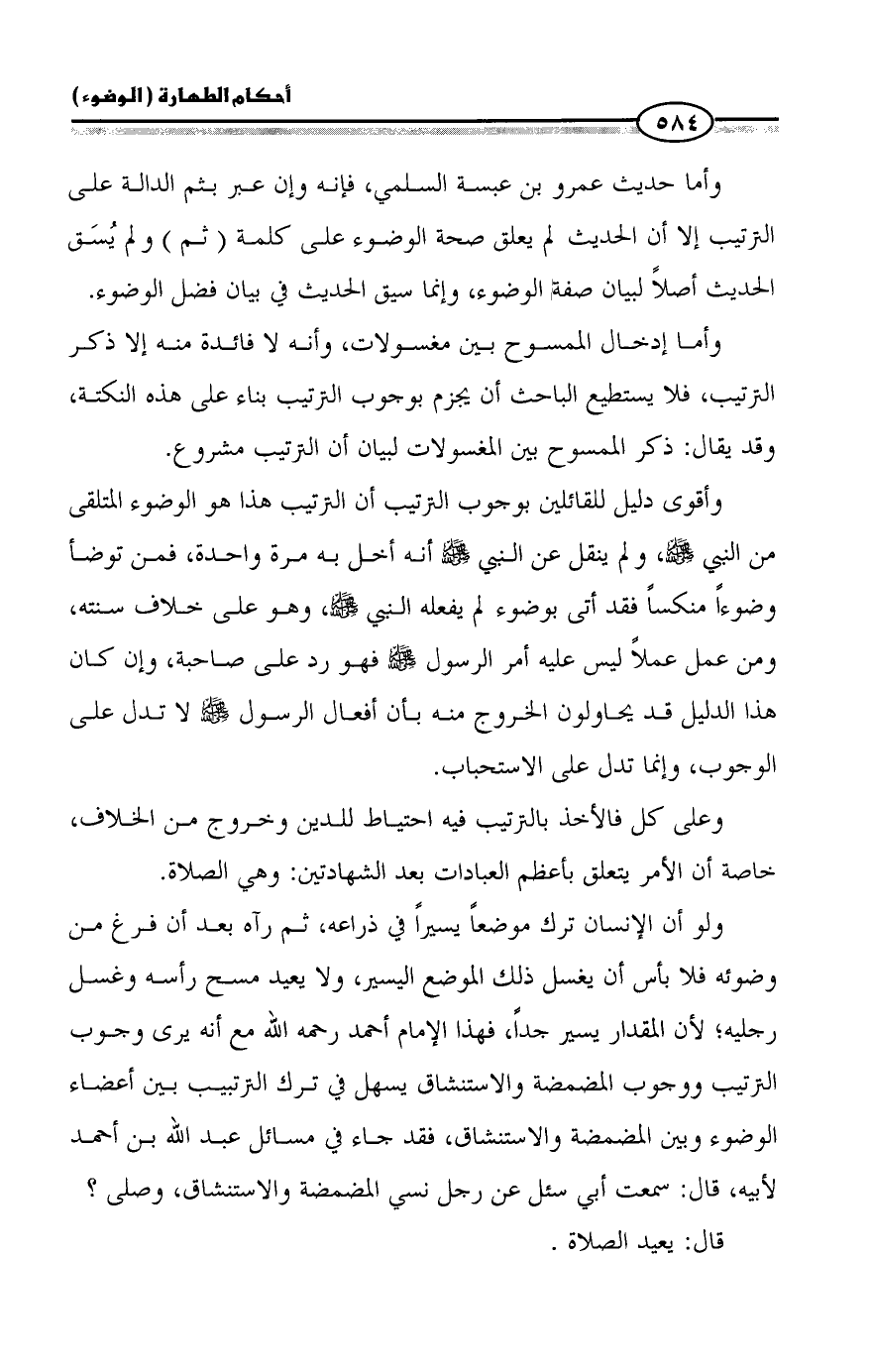 وأما حديث عمرو بن عبسة السلمي، فإنه وإن عبر بثم الدالة على الترتيب إلا أن الحديث لم يعلق صحة الوضوء على كلمة (ثم) ولم يُسَق الحديث أصلاً لبيان صفة الوضوء، وإنما سيق الحديث في بيان فضل الوضوء.