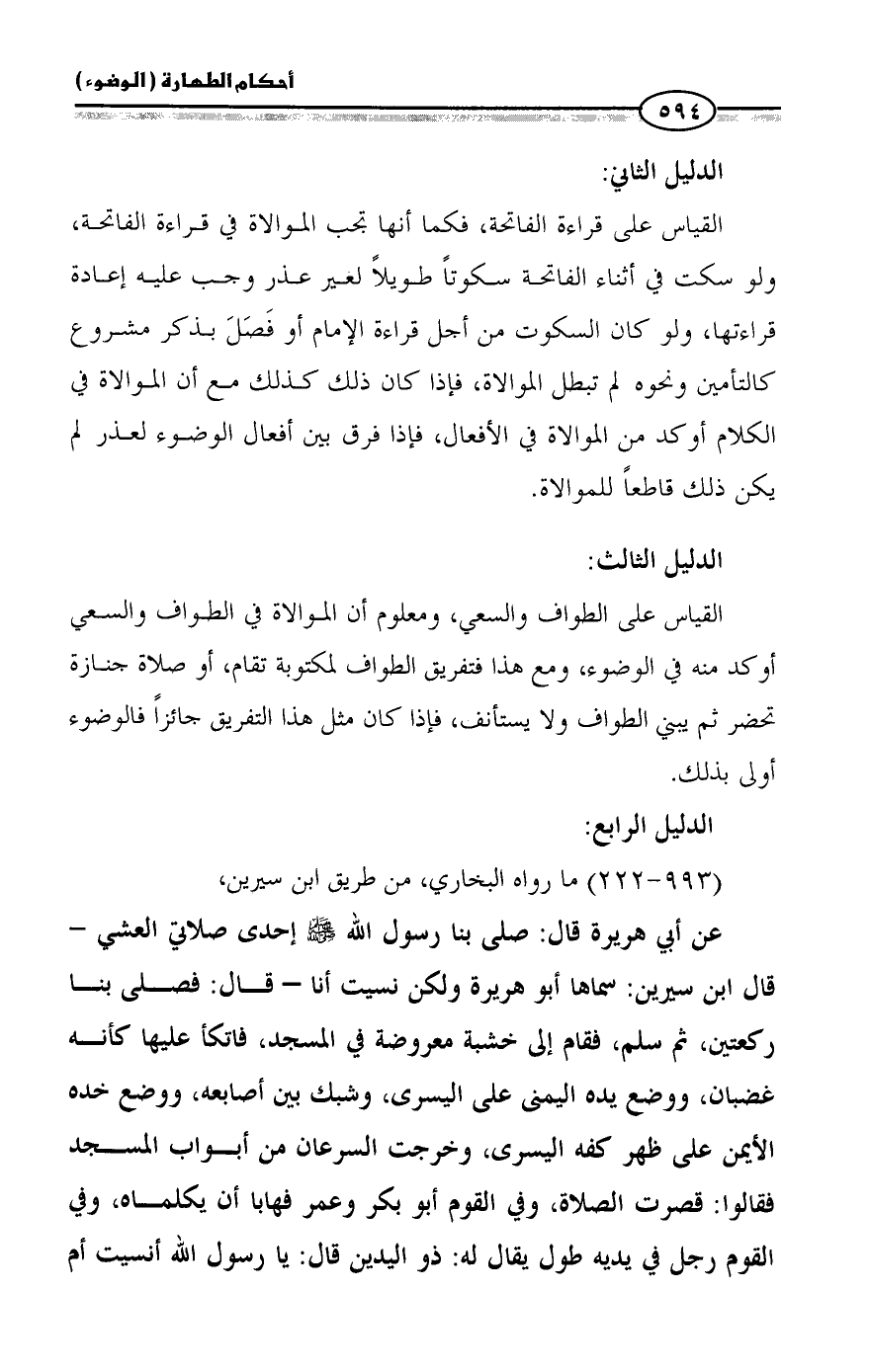 عن أبي هريرة قال: صلى بنا رسول الله - صلى الله عليه وسلم - إحدى صلاتي العشي - قال ابن سيرين: سماها أبو هريرة ولكن نسيت أنا - قال: فصلى بنا ركعتين، ثم سلم، فقام إلى خشبة معروضة في المسجد، فاتكأ عليها كأنه غضبان، ووضع يده اليمنى على اليسرى، وشبك بين أصابعه، ووضع خده الأيمن على ظهر كفه اليسرى، وخرجت السرعان من أبواب المسجد فقالوا: قصرت الصلاة، وفي القوم أبو بكر وعمر فهابا أن يكلماه، وفي القوم رجل في يديه طول يقال له: ذو اليدين قال: يا رسول الله أنسيت أم