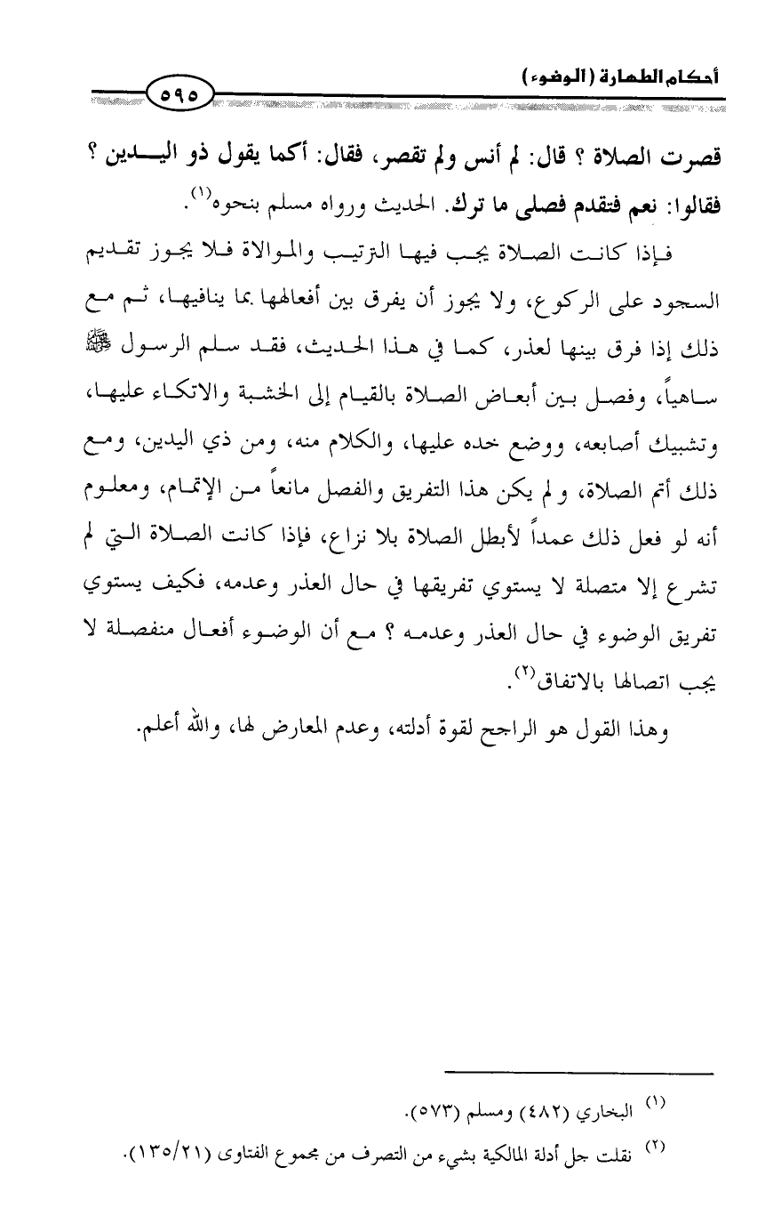 فإذا كانت الصلاة يجب فيها الترتيب والموالاة فلا يجوز تقديم السجود على الركوع، ولا يجوز أن يفرق بين أفعالهها بما ينافيها، ثم مع ذلك إذا فرق بينها لعذر، كما في هذا الحديث، فقد سلم الرسول - صلى الله عليه وسلم - ساهياً، وفصل بين أبعاض الصلاة بالقيام إلى الخشبة والاتكاء عليها، وتشبيك أصابعه، ووضع خده عليها، والكلام منه، ومن ذي اليدين، ومع ذلك أتم الصلاة، ولم يكن هذا التفريق والفصل مانعاً من الإتمام، ومعلوم أنه لو فعل ذلك عمداً لأبطل الصلاة بلا نزاع، فإذا كانت الصلاة التي لم تشرع إلا متصلة لا يستوي تفريقها في حال العذر وعدمه، فكيف يستوي تفريق الوضوء في حال العذر وعدمه؟ مع أن الوضوء أفعال منفصلة لا يجب اتصالها بالاتفاق (¬2).