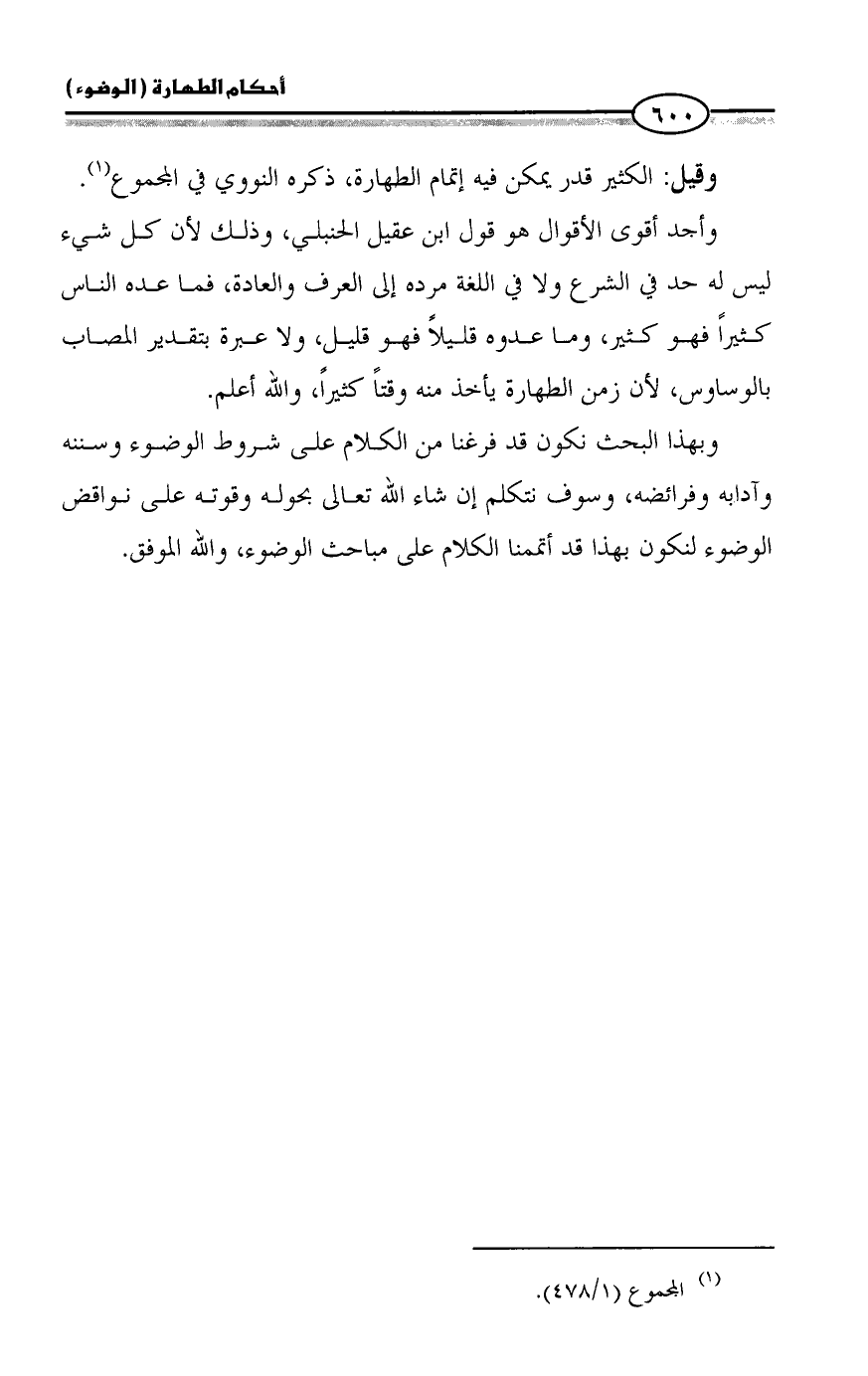 وأجد أقوى الأقوال هو قول ابن عقيل الحنبلي، وذلك لأن كل شيء ليس له حد في الشرع ولا في اللغة مرده إلى العرف والعادة، فما عده الناس كثيراً فهو كثير، وما عدوه قليلاً فهو قليل، ولا عبرة بتقدير المصاب بالوساوس، لأن زمن الطهارة يأخذ منه وقتاً كثيراً، والله أعلم.