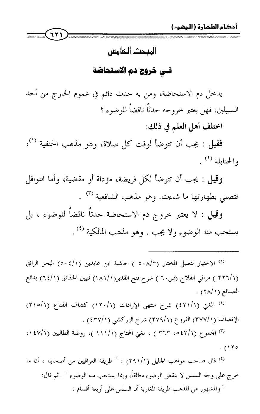 وقيل: لا يعتبر خروج دم الاستحاضة حدثاً ناقضاً للوضوء، بل يستحب منه الوضوء ولا يجب. وهو مذهب المالكية (¬4).