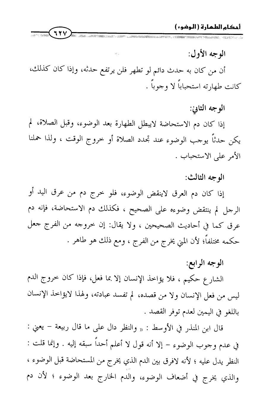 قال ابن المنذر في الأوسط: ((والنظر دال على ما قال ربيعة - يعني: في عدم وجوب الوضوء - إلا أنه قول لا أعلم أحداً سبقه إليه. وإنما قلت: النظر يدل عليه؛ لأنه لافرق بين الدم الذي يخرج من المستحاضة قبل الوضوء، والذي يخرج في أضعاف الوضوء، والدم الخارج بعد الوضوء؛ لأن دم