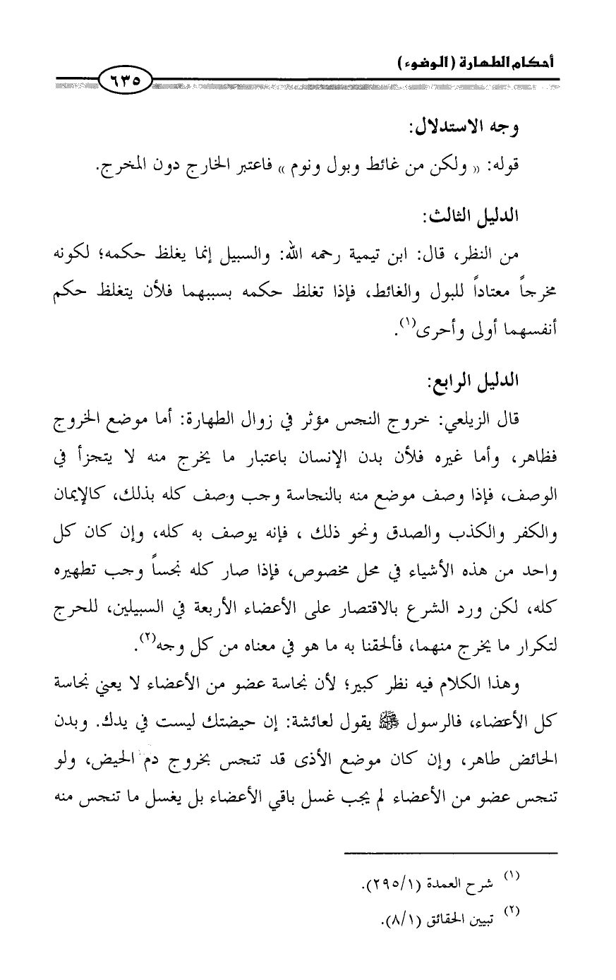 قال الزيلعي: خروج النجس مؤثر في زوال الطهارة: أما موضع الخروج فظاهر، وأما غيره فلأن بدن الإنسان باعتبار ما يخرج منه لا يتجزأ في الوصف، فإذا وصف موضع منه بالنجاسة وجب وصف كله بذلك، كالإيمان والكفر والكذب والصدق ونحو ذلك، فإنه يوصف به كله، وإن كان كل واحد من هذه الأشياء في محل مخصوص، فإذا صار كله نجساً وجب تطهيره كله، لكن ورد الشرع بالاقتصار على الأعضاء الأربعة في السبيلين، للحرج لتكرار ما يخرج منهما، فألحقنا به ما هو في معناه من كل وجه (¬2).