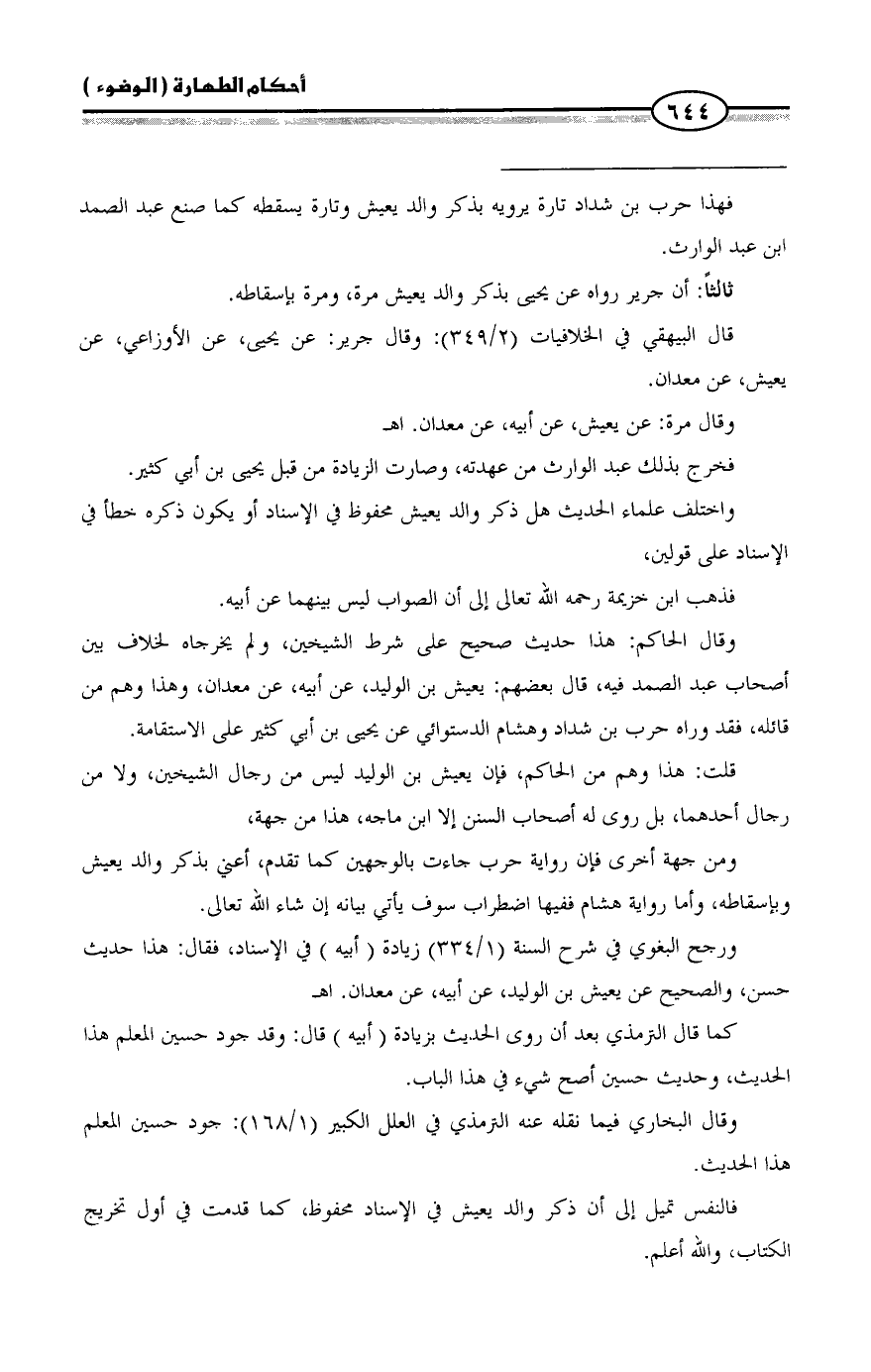 ومن جهة أخرى فإن رواية حرب جاءت بالوجهين كما تقدم، أعني بذكر والد يعيش وبإسقاطه، وأما رواية هشام ففيها اضطراب سوف يأتي بيانه إن شاء الله تعالى.