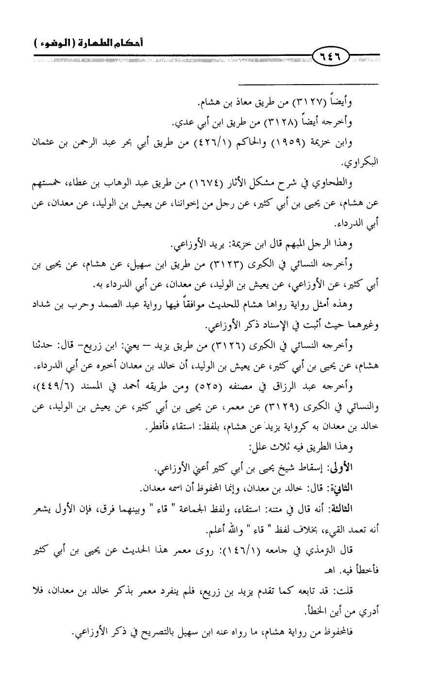 والطحاوي في شرح مشكل الأثار (1674) من طريق عبد الوهاب بن عطاء، خمستهم عن هشام، عن يحيى بن أبي كثير، عن رجل من إخواننا، عن يعيش بن الوليد، عن معدان، عن أبي الدرداء.