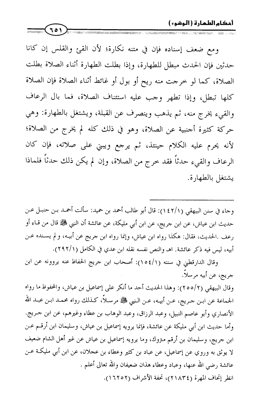 = وجاء في سنن البيهقي (1/ 142): قال أبو طالب أحمد بن حميد: سألت أحمد بن حنبل عن حديث ابن عياش، عن ابن جريج، عن ابن أبي مليكة، عن عائشة أن النبي - صلى الله عليه وسلم - قال من قاء أو رعف. الحديث، فقال: هكذا رواه ابن عياش، وإنما رواه ابن جريج عن أبيه، ولم يسنده عن أبيه، ليس فيه ذكر عائشة. اهـ والنص نفسه نقله ابن عدي في الكامل (1/ 292).