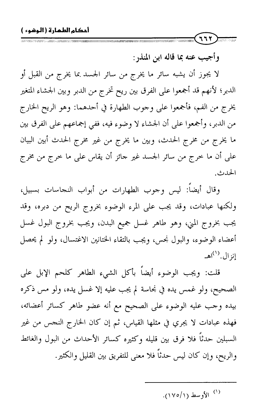قلت: ويجب الوضوء أيضاً بأكل الشيء الطاهر كلحم الإبل على الصحيح، ولو غمس يده في نجاسة لم يجب عليه إلا غسل يده، ولو مس ذكره بيده وجب عليه الوضوء على الصحيح مع أنه عضو طاهر كسائر أعضائه، فهذه عبادات لا يجري في مثلها القياس، ثم إن كان الخارج النجس من غير السبلين حدثاً فلا فرق بين قليله وكثيره كسائر الأحداث من البول والغائط والريح، وإن كان ليس حدثاً فلا معنى للتفريق بين القليل والكثير.