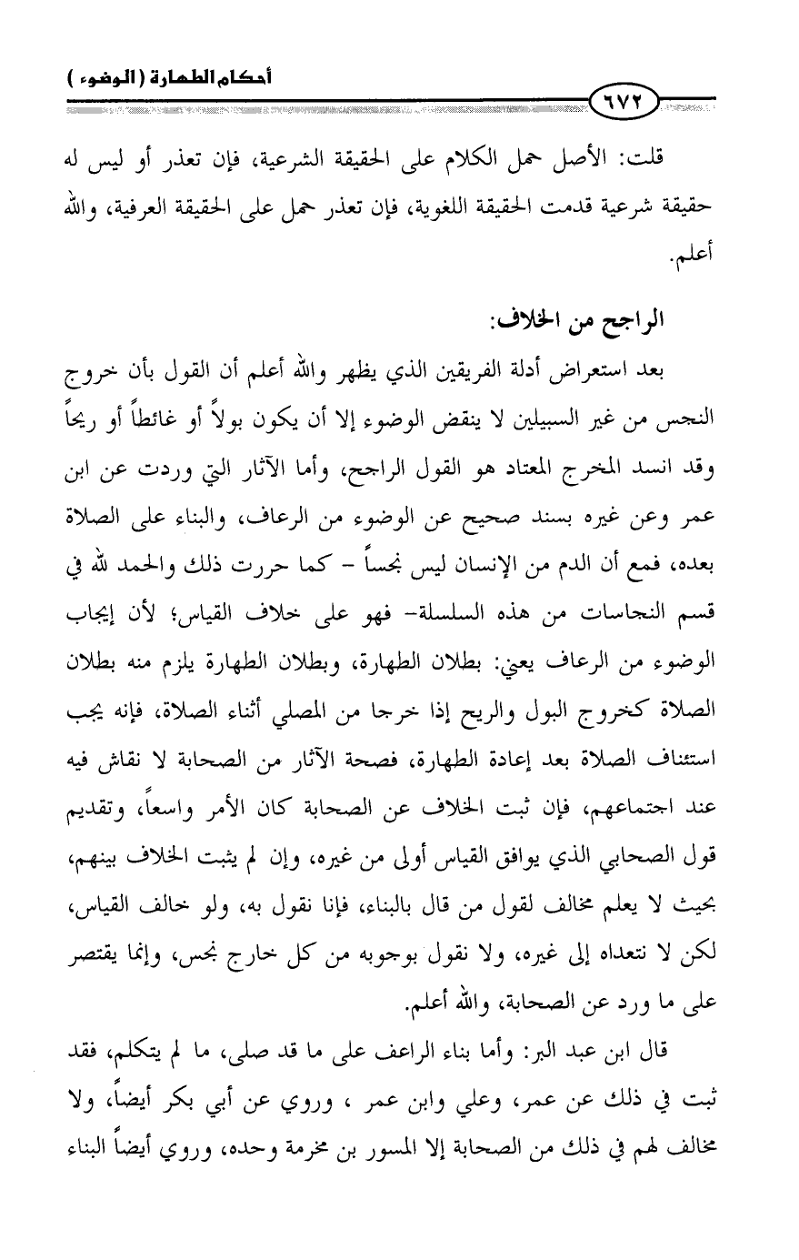 بعد استعراض أدلة الفريقين الذي يظهر والله أعلم أن القول بأن خروج النجس من غير السبيلين لا ينقض الوضوء إلا أن يكون بولاً أو غائطاً أو ريحاً وقد انسد المخرج المعتاد هو القول الراجح، وأما الآثار التي وردت عن ابن عمر وعن غيره بسند صحيح عن الوضوء من الرعاف، والبناء على الصلاة بعده، فمع أن الدم من الإنسان ليس نجساً - كما حررت ذلك والحمد لله في قسم النجاسات من هذه السلسلة- فهو على خلاف القياس؛ لأن إيجاب الوضوء من الرعاف يعني: بطلان الطهارة، وبطلان الطهارة يلزم منه بطلان الصلاة كخروج البول والريح إذا خرجا من المصلي أثناء الصلاة، فإنه يجب استئناف الصلاة بعد إعادة الطهارة، فصحة الآثار من الصحابة لا نقاش فيه عند اجتماعهم، فإن ثبت الخلاف عن الصحابة كان الأمر واسعاً، وتقديم قول الصحابي الذي يوافق القياس أولى من غيره، وإن لم يثبت الخلاف بينهم، بحيث لا يعلم مخالف لقول من قال بالبناء، فإنا نقول به، ولو خالف القياس، لكن لا نتعداه إلى غيره، ولا نقول بوجوبه من كل خارج نجس، وإنما يقتصر على ما ورد عن الصحابة، والله أعلم.