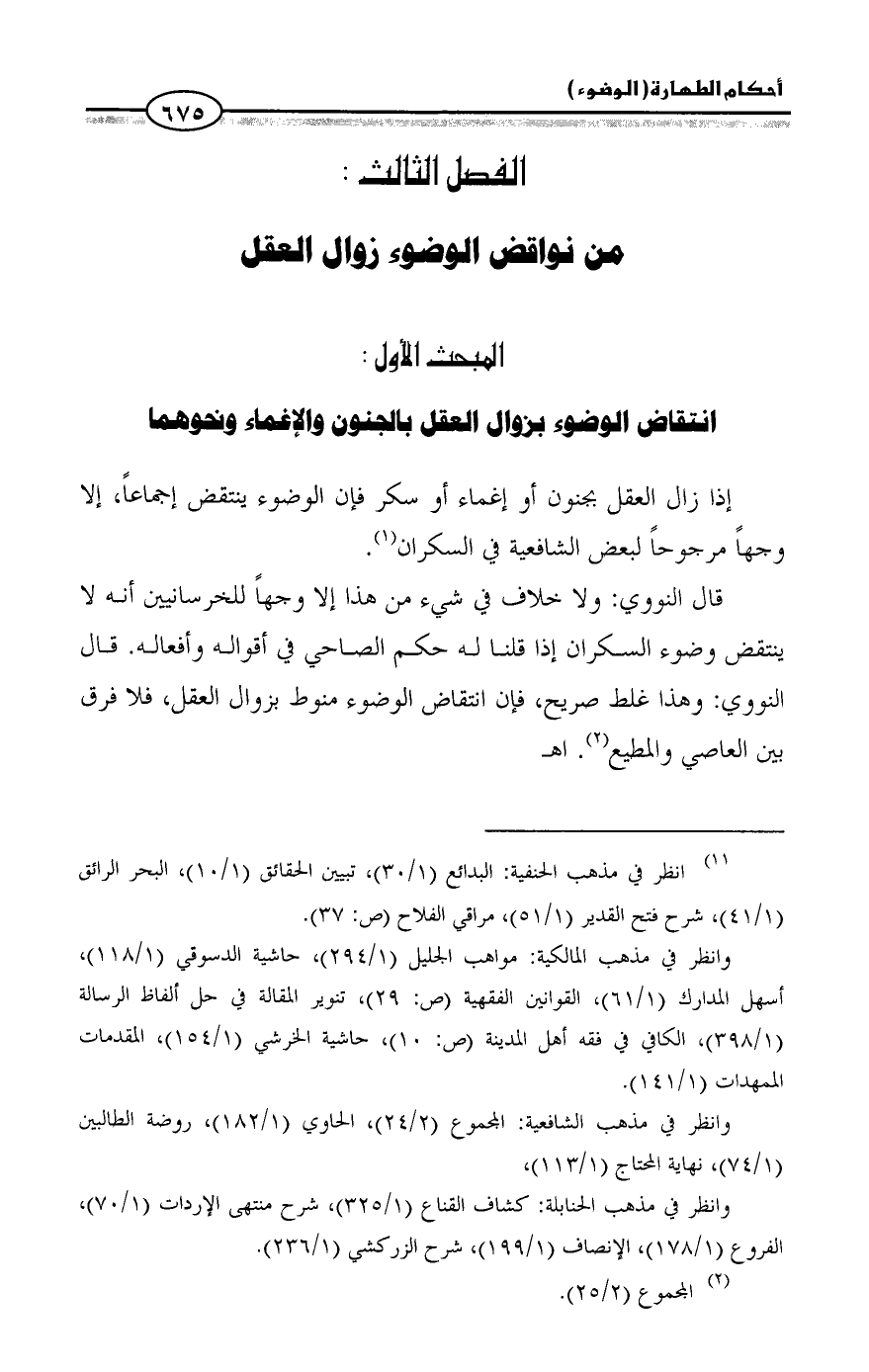 قال النووي: ولا خلاف في شيء من هذا إلا وجهاً للخرسانيين أنه لا ينتقض وضوء السكران إذا قلنا له حكم الصاحي في أقواله وأفعاله. قال النووي: وهذا غلط صريح، فإن انتقاض الوضوء منوط بزوال العقل، فلا فرق بين العاصي والمطيع (¬2). اهـ