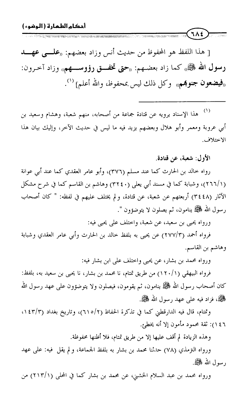 رواه خالد بن الحارث كما عند مسلم (376)، وأبو عامر العقدي كما عند أبي عوانة (1/ 266)، وشبابة كما في مسند أبي يعلى (3240) وهاشم بن القاسم كما في شرح مشكل الآثار (3448) أربعتهم عن شعبة، عن قتادة، ولم يختلف عليهم في لفظه: " كان أصحاب رسول الله - صلى الله عليه وسلم - ينامون، ثم يصلون لا يتوضؤون ".