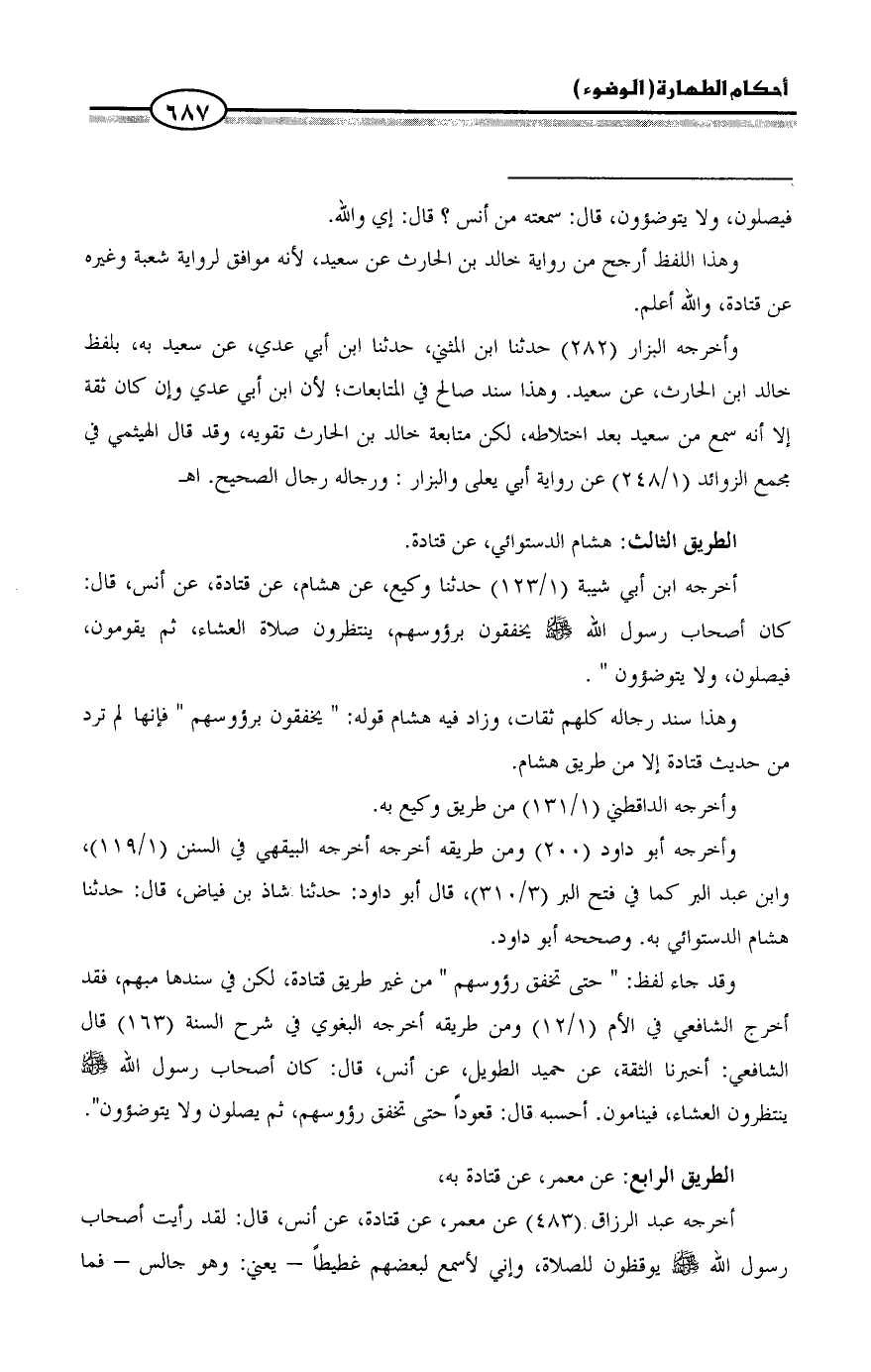 وقد جاء لفظ: " حتى تخفق رؤوسهم " من غير طريق قتادة، لكن في سندها مبهم، فقد أخرج الشافعي في الأم (1/ 12) ومن طريقه أخرجه البغوي في شرح السنة (163) قال الشافعي: أخبرنا الثقة، عن حميد الطويل، عن أنس، قال: كان أصحاب رسول الله - صلى الله عليه وسلم - ينتظرون العشاء، فينامون. أحسبه قال: قعوداً حتى تخفق رؤوسهم، ثم يصلون ولا يتوضؤون".