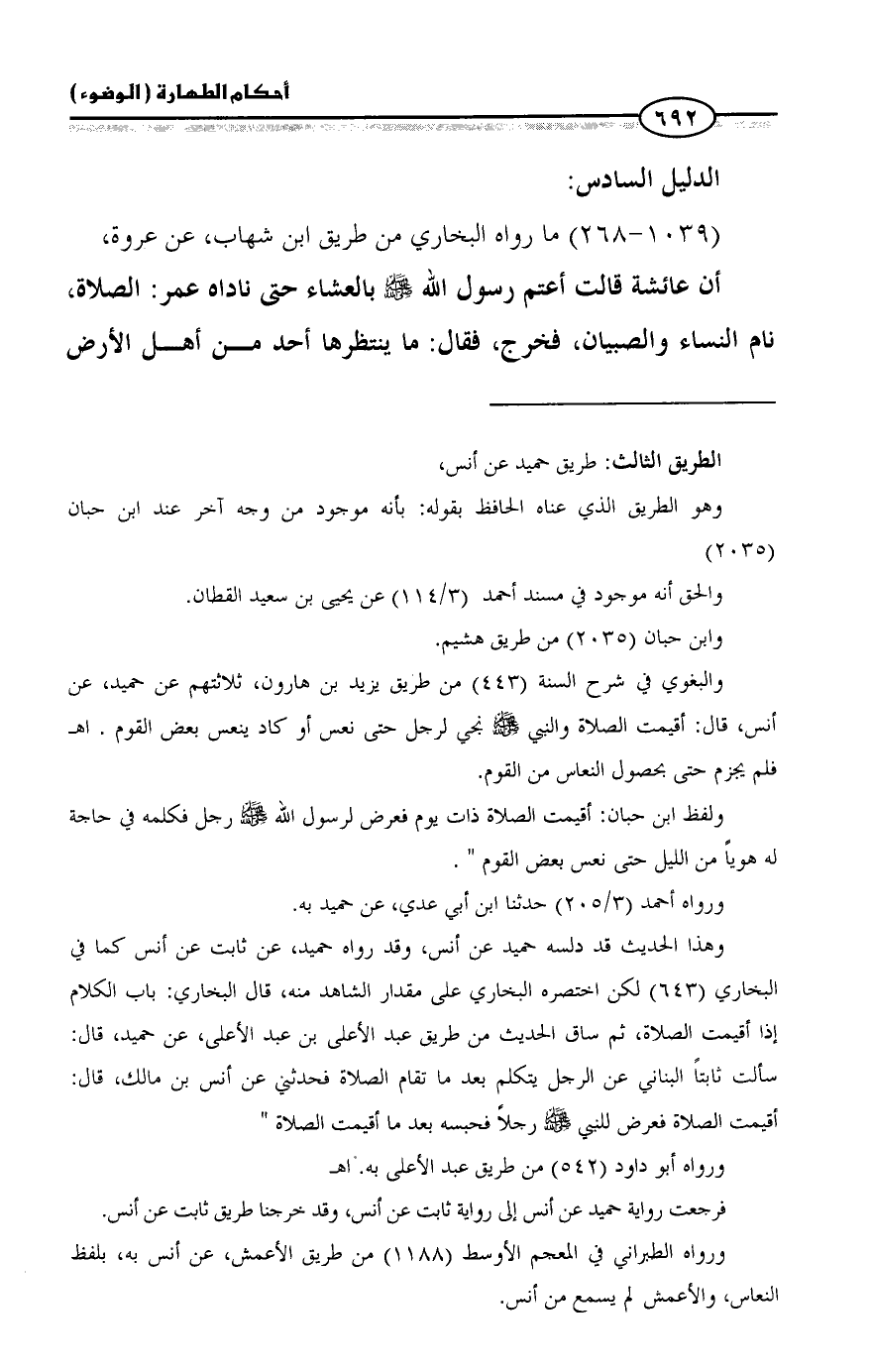 ولفظ ابن حبان: أقيمت الصلاة ذات يوم فعرض لرسول الله - صلى الله عليه وسلم - رجل فكلمه في حاجة له هوياً من الليل حتى نعس بعض القوم ".