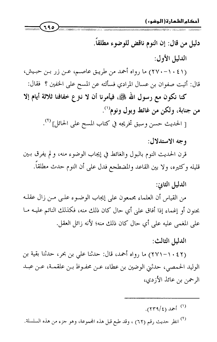 (1041 - 270) ما رواه أحمد من طريق عاصم، عن زر بن حبيش، قال: أتيت صفوان بن عسال المرادي فسألته عن المسح على الخفين؟ فقال: