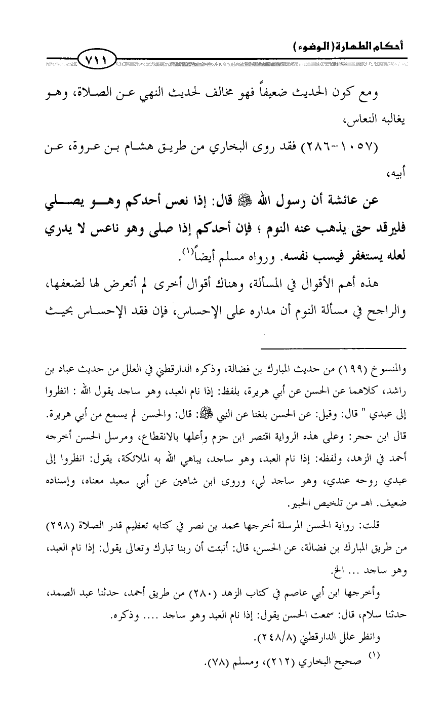 = والمنسوخ (199) من حديث المبارك بن فضالة، وذكره الدارقطني في العلل من حديث عباد بن راشد، كلاهما عن الحسن عن أبي هريرة، بلفظ: إذا نام العبد، وهو ساجد يقول الله: انظروا إلى عبدي " قال: وقيل: عن الحسن بلغنا عن النبي - صلى الله عليه وسلم -: قال: والحسن لم يسمع من أبي هريرة. قال ابن حجر: وعلى هذه الرواية اقتصر ابن حزم وأعلها بالانقطاع، ومرسل الحسن أخرجه أحمد في الزهد، ولفظه: إذا نام العبد، وهو ساجد، يباهي الله به الملائكة، يقول: انظروا إلى عبدي روحه عندي، وهو ساجد لي، وروى ابن شاهين عن أبي سعيد معناه، وإسناده ضعيف. اهـ من تلخيص الحبير.