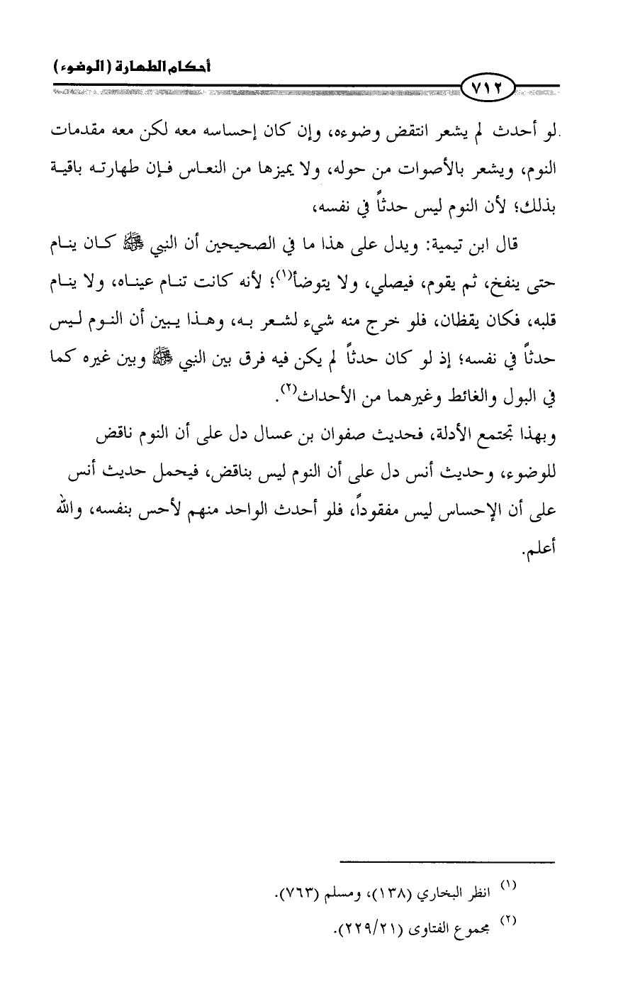 قال ابن تيمية: ويدل على هذا ما في الصحيحين أن النبي - صلى الله عليه وسلم - كان ينام حتى ينفخ، ثم يقوم، فيصلي، ولا يتوضأ (¬1)؛ لأنه كانت تنام عيناه، ولا ينام قلبه، فكان يقظان، فلو خرج منه شيء لشعر به، وهذا يبين أن النوم ليس حدثاً في نفسه؛ إذ لو كان حدثاً لم يكن فيه فرق بين النبي - صلى الله عليه وسلم - وبين غيره كما في البول والغائط وغيرهما من الأحداث (¬2).