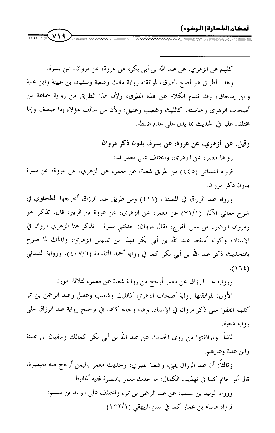 ورواه عبد الرزاق في المصنف (411) ومن طريق عبد الرزاق أخرجها الطحاوي في شرح معاني الآثار (1/ 71) عن معمر، عن الزهري، عن عروة بن الزبير، قال: تذكرا هو ومروان الوضوء من مس الفرج، فقال مروان: حدثتني بسرة. فذكر هنا الزهري مروان في الإسناد، وكونه أسقط عبد الله بن أبي بكر فهذا من تدليس الزهري، ولذلك لما صرح بالتحديث ذكر عبد الله بن أبي بكر كما في رواية أحمد المتقدمة (6/ 407)، ورواية النسائي (164).