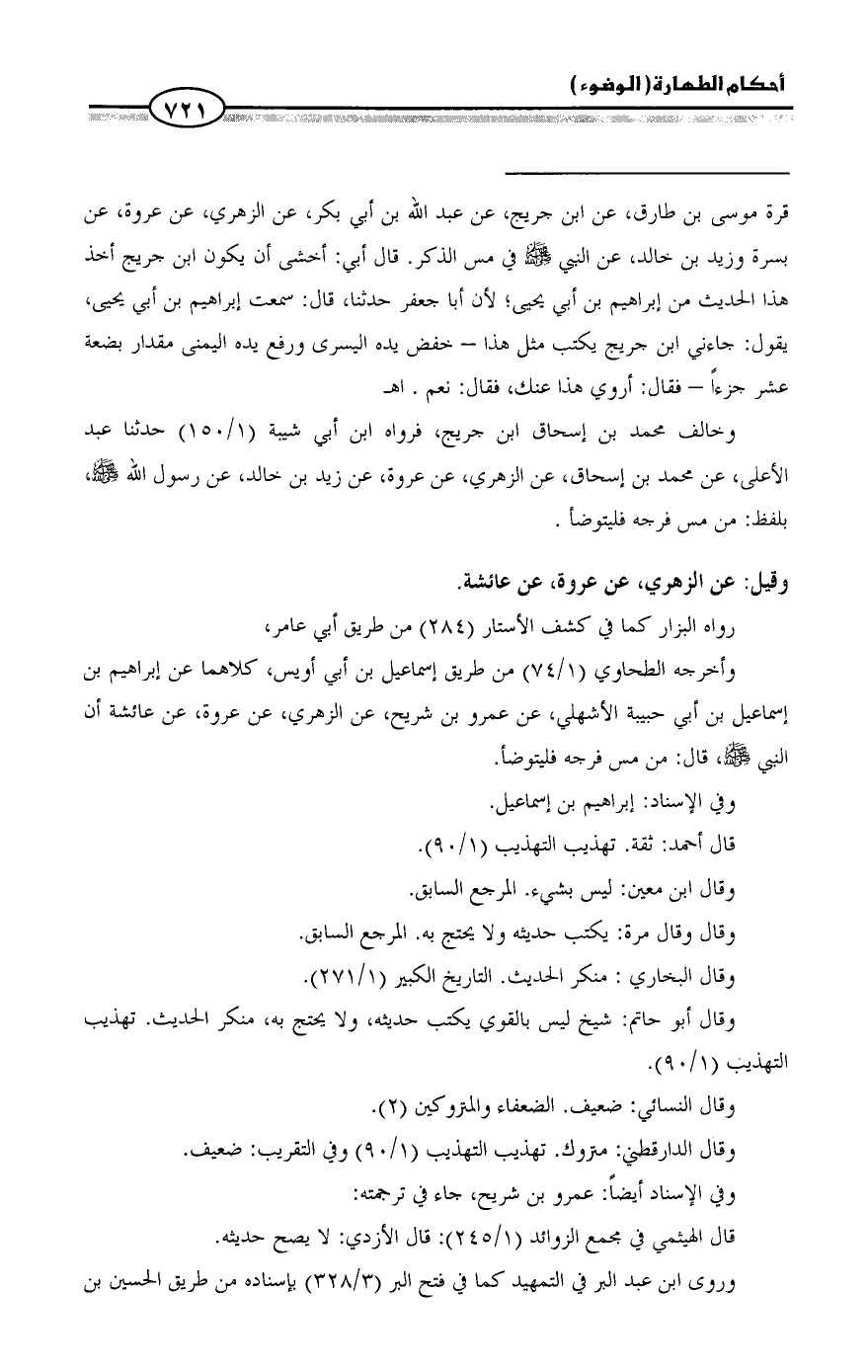 وأخرجه الطحاوي (1/ 74) من طريق إسماعيل بن أبي أويس، كلاهما عن إبراهيم بن إسماعيل بن أبي حبيبة الأشهلي، عن عمرو بن شريح، عن الزهري، عن عروة، عن عائشة أن النبي - صلى الله عليه وسلم -، قال: من مس فرجه فليتوضأ.