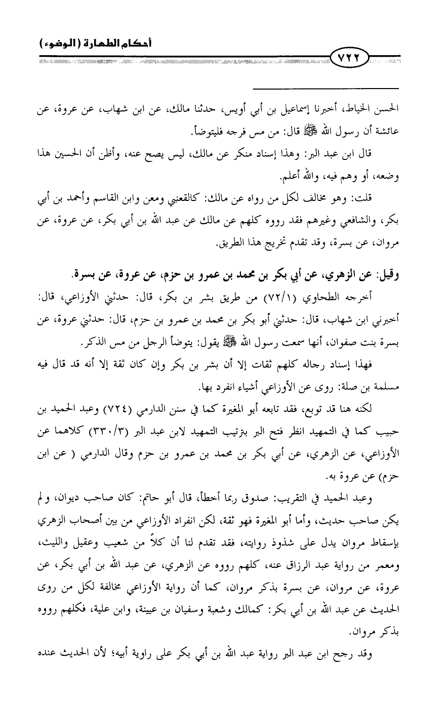 وعبد الحميد في التقريب: صدوق ربما أخطأ، قال أبو حاتم: كان صاحب ديوان، ولم يكن صاحب حديث، وأما أبو المغيرة فهو ثقة، لكن انفراد الأوزاعي من بين أصحاب الزهري بإسقاط مروان يدل على شذوذ روايته، فقد تقدم لنا أن كلاً من شعيب وعقيل والليث، ومعمر من رواية عبد الرزاق عنه، كلهم رووه عن الزهري، عن عبد الله بن أبي بكر، عن عروة، عن مروان، عن بسرة بذكر مروان، كما أن رواية الأوزاعي مخالفة لكل من روى الحديث عن عبد الله بن أبي بكر: كمالك وشعبة وسفيان بن عيينة، وابن علية، فكلهم رووه بذكر مروان.
