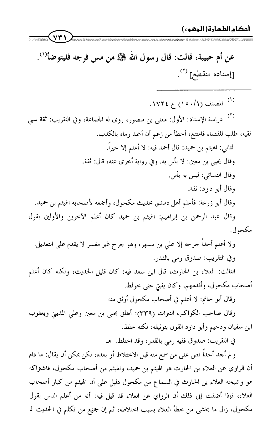ولم أجد أحداً نص على من سمع منه قبل الاختلاط أو بعده، لكن يمكن أن يقال: ما دام أن الراوي عن العلاء بن الحارث هو الهيثم بن حميد، والهيثم من أصحاب مكحول، فاشتراكه هو وشيخه العلاء بن الحارث في السماع من مكحول دليل على أن الهيثم من كبار أصحاب العلاء، فإذا أضفت إلى ذلك أن الرواي عن العلاء قد قيل فيه: أنه من أعلم الناس بقول مكحول، زال ما يخشى من خطأ العلاء بسبب اختلاطه، ثم إن جميع من تكلم في الحديث لم =