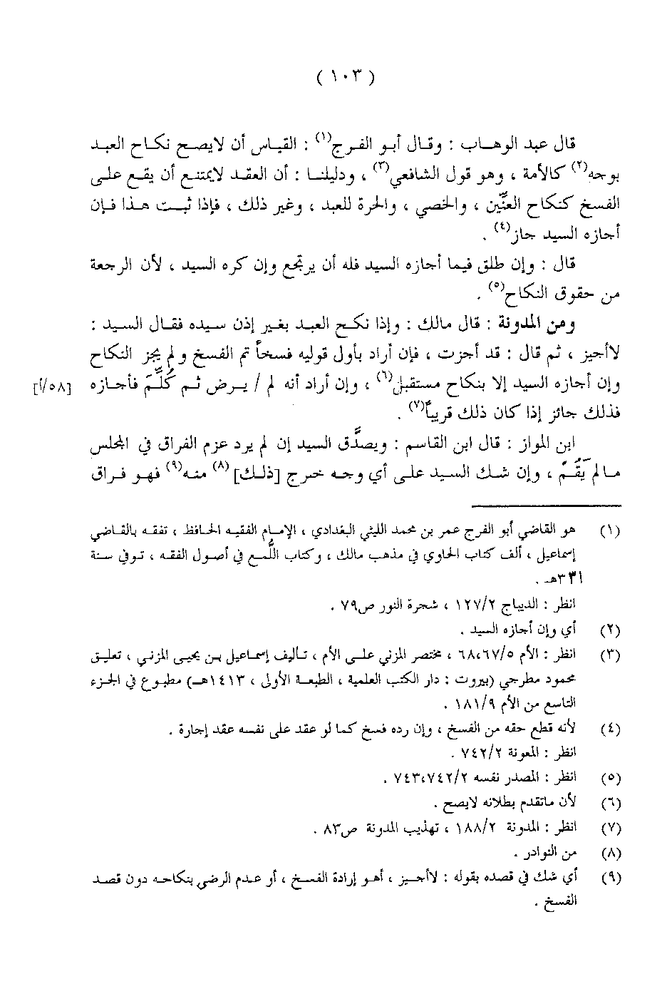 قال عبد الوهاب: وقال أبو الفرج: القياس أن لا يصح نكاح العبد بوجه كالأمة، وهو قول الشافعي، ودليلنا: أن العقد لا يمتنع أن يقع على الفسخ كنكاح العنِّين، والخصي، والحرة للعبد، وغير ذلك، فإذا ثبت هذا فإن أجازه السيد جاز.