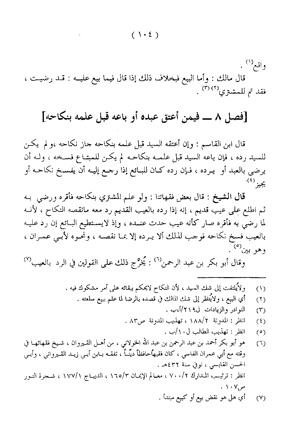 قال ابن القاسم: وإن أعتقه السيد قبل علمه بنكاحه جاز نكاحه، ولم يكن للسيد رده، فإن باعه السيد قبل علمه بنكاحه لم يكن للمبتاع فسخه، وله أن يرضى بالعبد أو يرده، فإن رده كان للبائع إذا رجع إليه أن يفسخ نكاحه أو يجيز.