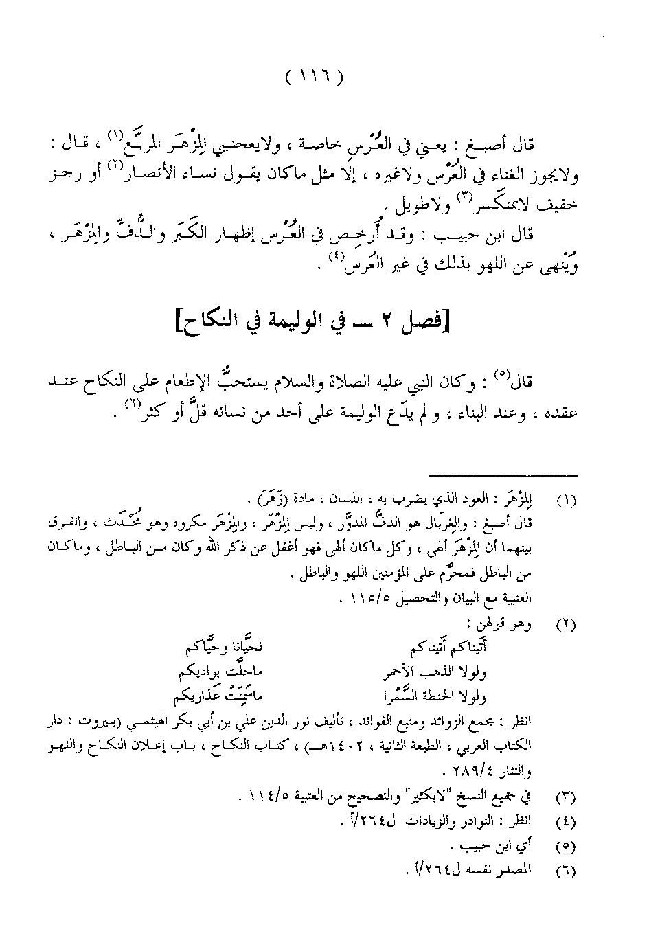 قال أصبغ: يعني في العُرْسِ خاصة، ولا يعجبني المِزْهَر المربَّع، قال: ولا يجوز الغناء في العُرْس ولا غيره، إلا مثل ما كان يقول نساء الأنصار أو رجز خفيف لا بمنكَر ولا طويل.