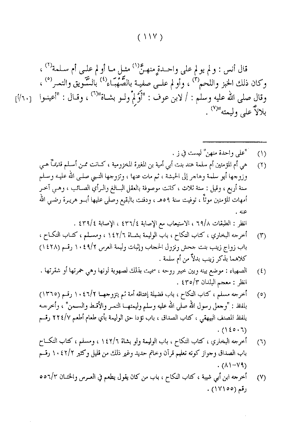 قال أنس: ولم يولم على واحدةٍ منهنَّ مثل ما أولم على أم سلمة، وكان ذلك الخبز واللحم، وأولم على صفية بالصَّهبَاء بالسَّويق والتمر، وقال صلى الله عليه وسلم: لابن عوف: «أَوْلِمْ ولو بشاة»، وقال: «أعينوا بلالاً على وليمته».