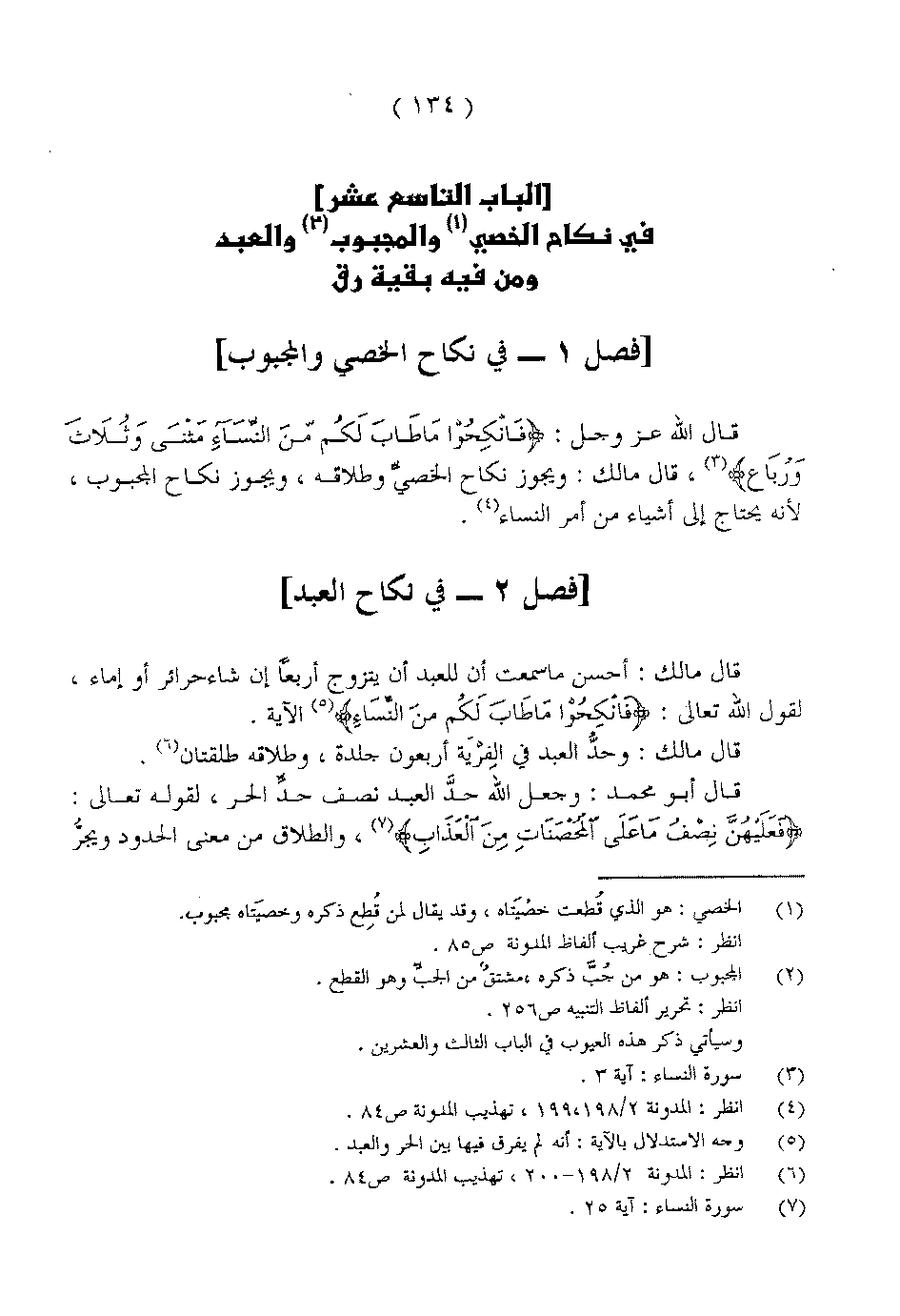 قال الله عز وجل: {فَانكِحُوا مَا طَابَ لَكُمْ مِنَ النِّسَاءِ مَثْنَى وَثُلاثَ وَرُبَاعَ} [النساء: 3]، قال مالك: ويجوز نكاح الخصيِّ وطلاقه، ويجوز نكاح المجبوب، لأنه يحتاج إلى أشياء من أمر النساء.