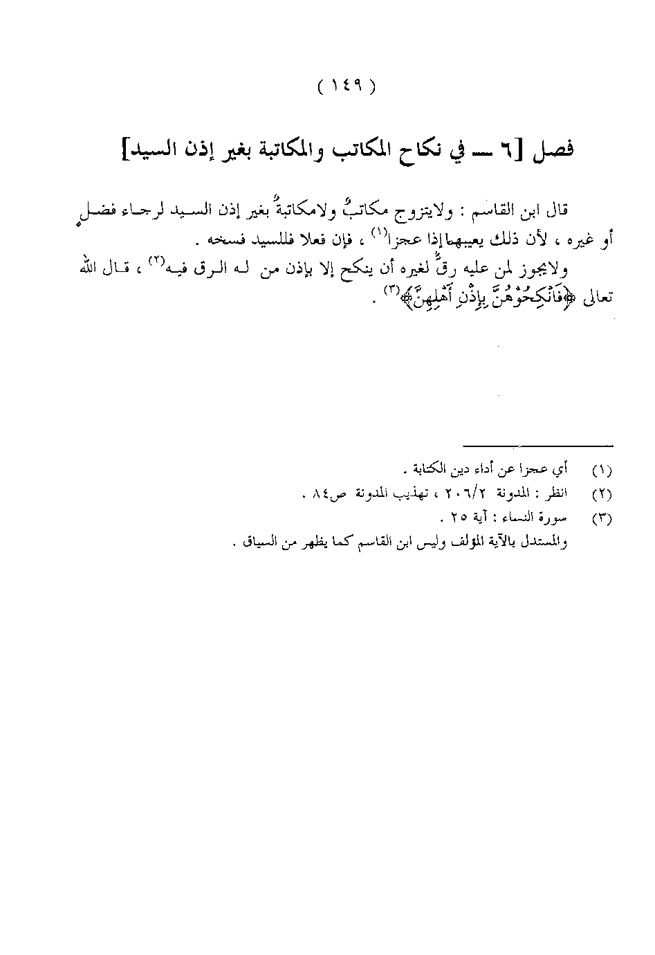 قال ابن القاسم: ولا يتزوج مكاتبٌ ولا مكاتبةٌ بغير إذن السيد لرجاء فضلٍ أو غيره، لأن ذلك يعيبها إذا عجزا، فإن فعلا فللسيد فسخه.