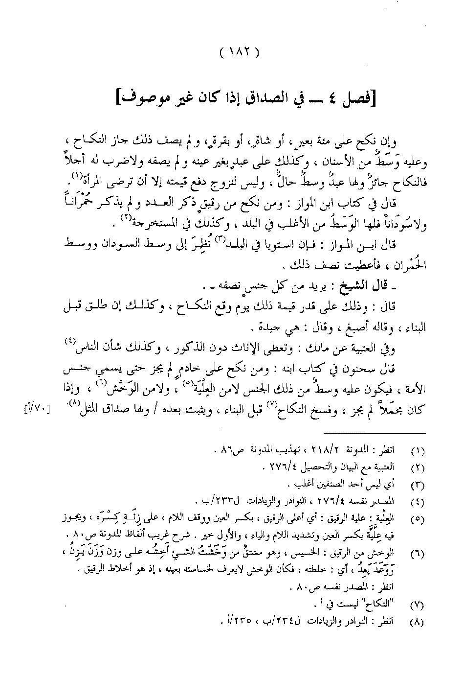 وإن نكح على مئة بعيرٍ، أو شاةٍ، أو بقرةٍ، ولم يصف ذلك جاز النكاح، وعليه وسط من الأسنان، وكذلك على عبدٍ بغير عينه ولم يصفه ولا ضرب له أجلاً فالنكاح جائزٌ ولها عبدٌ وسطٌ حالٌ، وليس للزوج دفع قيمته إلا أن ترضى المرأة.