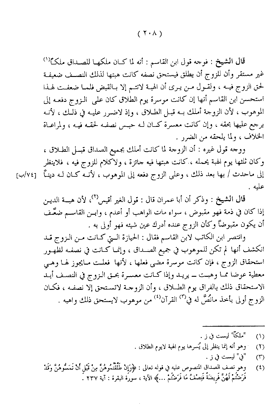 قال الشيخ: وذكر أن أبا عمران قال: قول الغير أقيس، لأن هبة الدين إذا كان في ذمة فهو مقبوض، سواء مات الواهب أو أعدم، وابن القاسم ضعف أن يكون مقبوضاً وكأن الزوج عنده أدرك عين شيئه فهو أولى به.