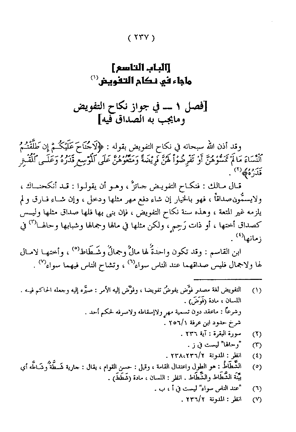 وقد أذن الله سبحانه في نكاح التفويض بقوله: {لا جُنَاحَ عَلَيْكُمْ إِنْ طَلَّقْتُمُ النِّسَاءَ مَا لَمْ تَمَسُّوهُنَّ أَوْ تَفْرِضُوا لَهُنَّ فَرِيضَةً وَمَتِّعُوهُنَّ عَلَى الْمُوسِعِ قَدَرُهُ وَعَلَى الْمُقْتِرِ قَدَرُهُ}.