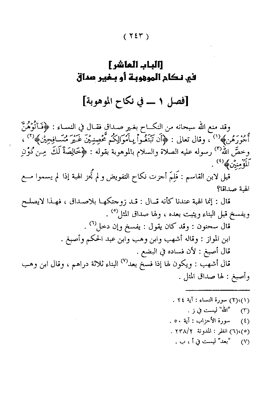 وقد منع الله سبحانه من النكاح بغير صداق فقال في النساء: {فَآتُوهُنَّ أُجُورَهُنَّ}، وقال تعالى: {أَنْ تَبْتَغُوا بِأَمْوَالِكُمْ مُحْصِنِينَ غَيْرَ مُسَافِحِينَ}، وخص الله رسوله عليه الصلاة والسلام بالموهوبة بقوله: {خَالِصَةً لَكَ مِنْ دُونِ الْمُؤْمِنِينَ}.