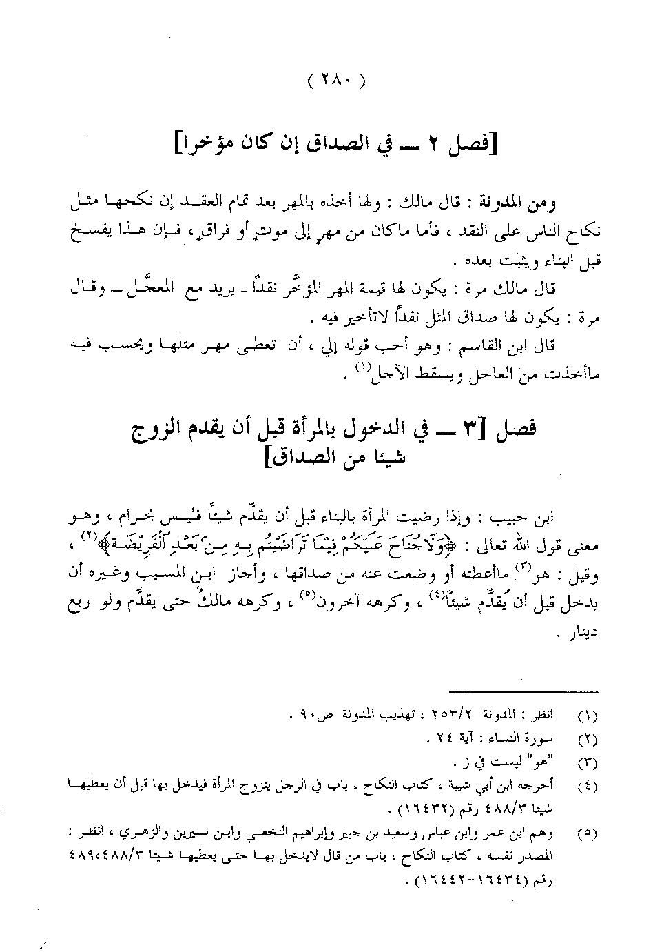 ابن حبيب: وإذا رضيت المرأة بالبناء قبل أن يقدم شيئاً فليس بحرام، وهو معنى قول الله تعالى: {وَلا جُنَاحَ عَلَيْكُمْ فِيمَا تَرَاضَيْتُمْ بِهِ مِنْ بَعْدِ الْفَرِيضَةِ}، وقيل: هو ما أعطته أو وضعت عنه من صداقها، وأجاز ابن المسيب وغيره أن يدخل قبل أن يقدم شيئاً، وكرهه آخرون، وكرهه مالك حتى يقدم ولو ربع دينار.