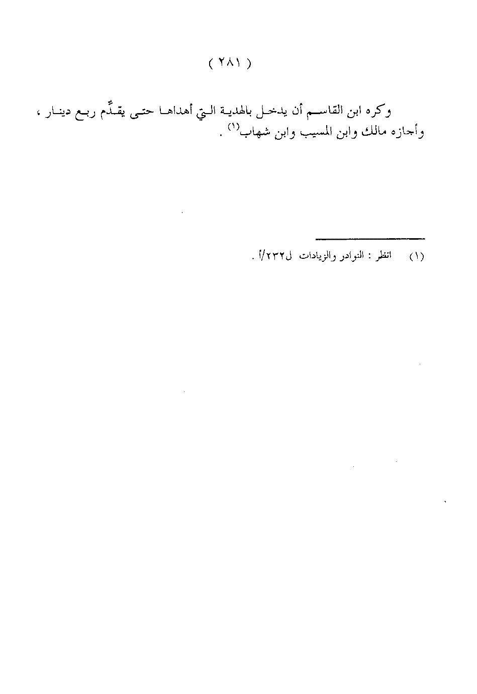 وكره ابن القاسم أن يدخل بالهدية التي أهداها حتى يقدم ربع دينار، وأجازه مالك وابن المسيب وابن شهاب.