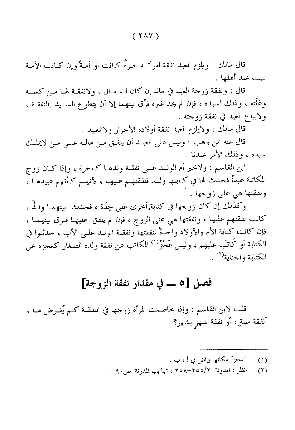 ابن القاسم: ولا تجبر أم الولد على نفقة ولدها كالحرة، وإذا كان زوج المكاتبة عبدًا فحدث لها في كتابتها ولد فنفقتهم عليها، لأنهم كأنهم عبيدها، ونفقتها هي على زوجها.