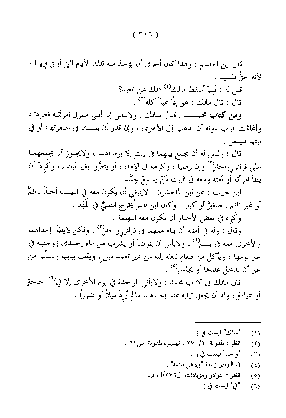 ابن حبيب: عن ابن الماجشون: لا ينبغي أن يكون معه في البيت أحد نائم أو غير نائم، صغير أو كبير، وكان ابن عمر يخرج الصبي في المهد.