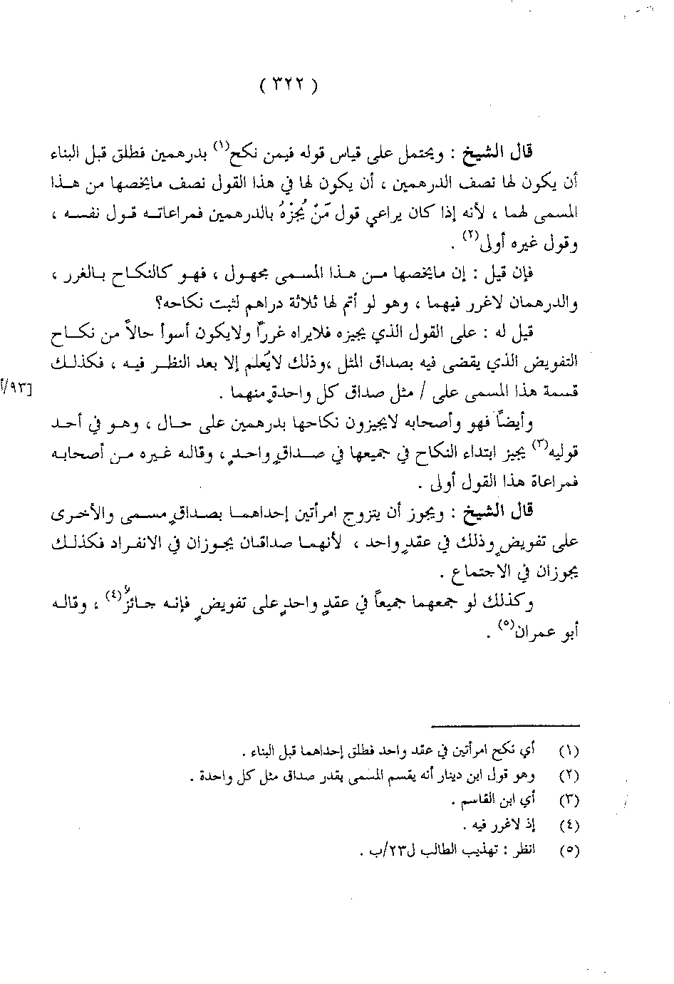 قال الشيخ: ويحتمل على قياس قوله فيمن نكح بدرهمين فطلق قبل البناء أن يكون لها نصف الدرهمين، أن يكون لها في هذا القول نصف ما يخصها في هذا المسمى لهما، لأنه كان يراعي قول مَنْ يُجِزْهُ بالدرهمين فمراعاته قول نفسه، وقول غيره أولى.