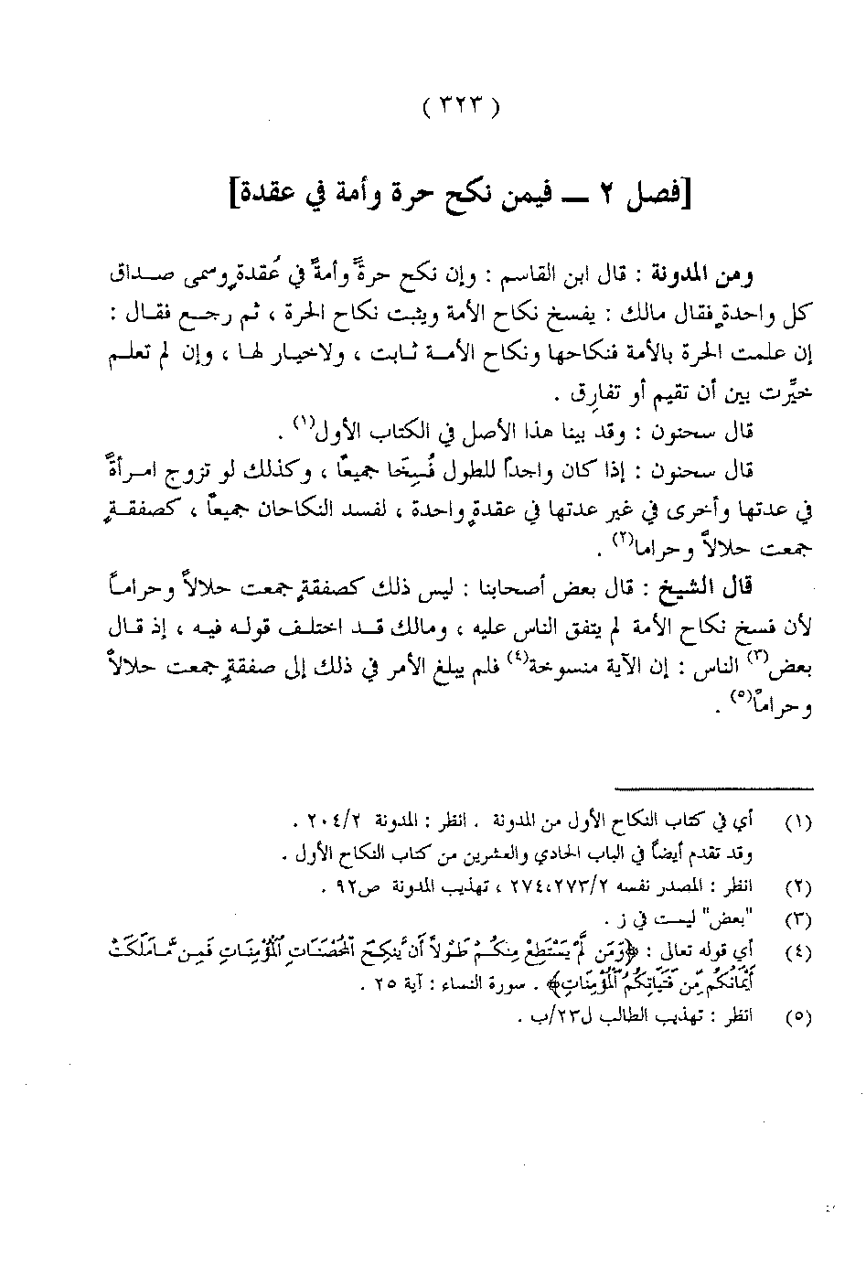 قال الشيخ: قال بعض أصحابنا: ليس ذلك كصفقة جمعت حلالاً وحراماً لأن فسخ نكاح الأمة لم يتفق الناس عليه، ومالك قد اختلف قوله فيه، إذ قال بعض الناس: إن الآية منسوخة فلم يبلغ الأمر في ذلك إلى صفقةٍ جمعت حلالاً وحراماً.