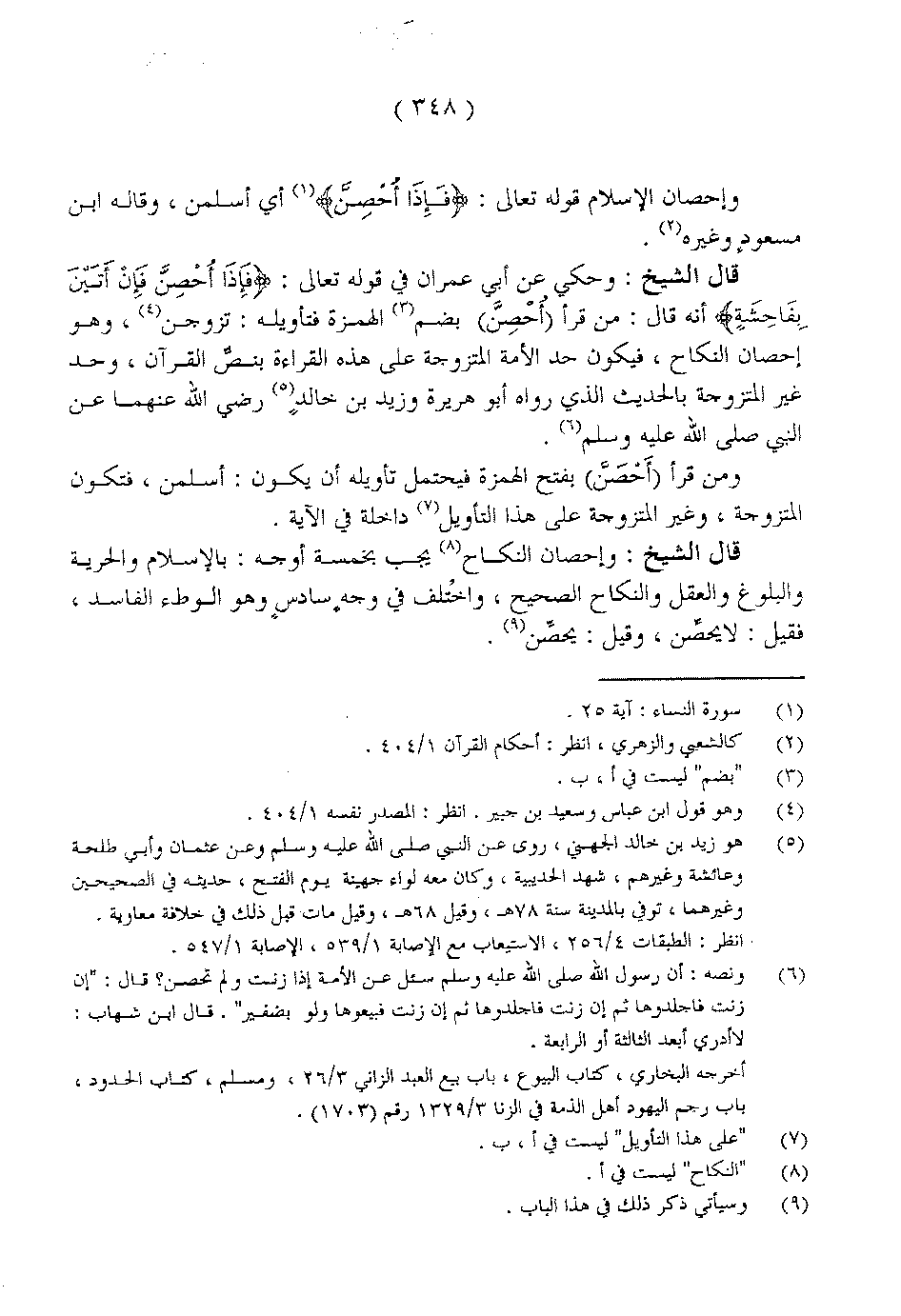 قال الشيخ: وحكى عن أبي عمران في قوله تعالى: {فَإذَا أُحْصِنَّ فَإنْ أَتَيْنَ بِفَاحِشَةٍ} أنه قال: من قرأ (أحصن) بضم الهمزة فتأويله: تزوجن، وهو إحصان النكاح، فيكون حد الأمة المتزوجة على هذه القراءة بنصِّ القرآن، وحد غير المتزوجة بالحديث الذي رواه أبو هريرة وزيد بن خالدٍ رضي الله عنهما وعن النبي صلى الله عليه وسلم.