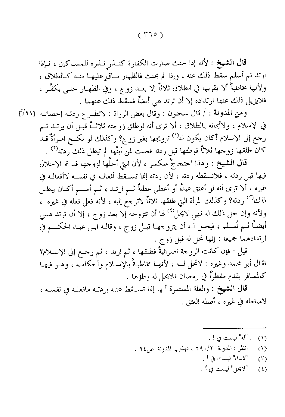 ومن المدونة:/ قال سحنون: وقال بعض الرواة: لا تطرح ردته إحصانه في الإسلام، ولا أيمانه بالطلاق، ألا ترى أنه لو طلق زوجته ثلاثاً قبل أن يرتد ثم رجع إلى الإسلام أكان يكون له تزويجها بغير زوج؟ وكذلك لو نكح امرأة قد كان طلقها زوجها ثلاثاً فوطئها قبل ردته فحلت لمن أبتها لم تبطل ذلك ردته.