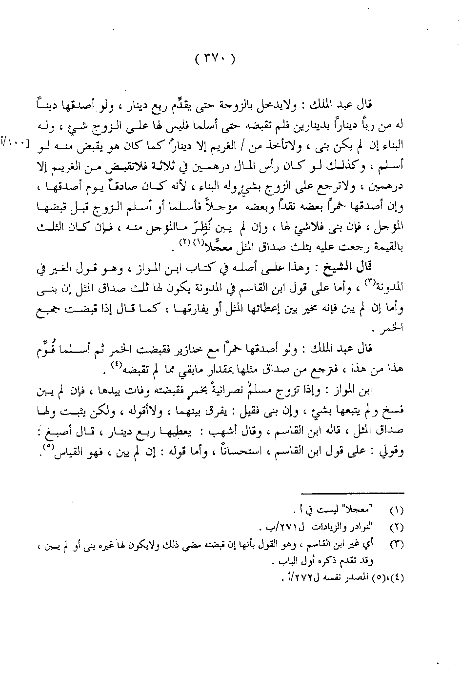 قال عبد الملك: ولا يدخل بالزوجة حتى يقدم ربع دينار، ولو أصدقها ديناً له من رباً ديناراً بدينارين فلم تقبضه حتى أسلما فليس لها على الزوج شيء، وله البناء إن لم يكن بنى، ولا تأخذ من/ الغريم إلا ديناراً كما كان هو يقبض منه لو أسلم، وكذلك لو كان رأس المال درهمين في ثلاثة فلا تقبض من الغريم إلا درهمين، ولا ترجع على الزوج بشيء وله البناء، لأنه كان صادقاً يوم أصدقها، وإن أصدقها خمراً بعضه نقداً وبعضه مؤجلاً فأسلما أو أسلم الزوج قبل قبضها المؤجل، فإن بنى فلا شيء لها، وإن لم يبن نظر ما المؤجل منه، فإن كان الثلث بالقيمة رجعت عليه بثلث صداق المثل معجلا.