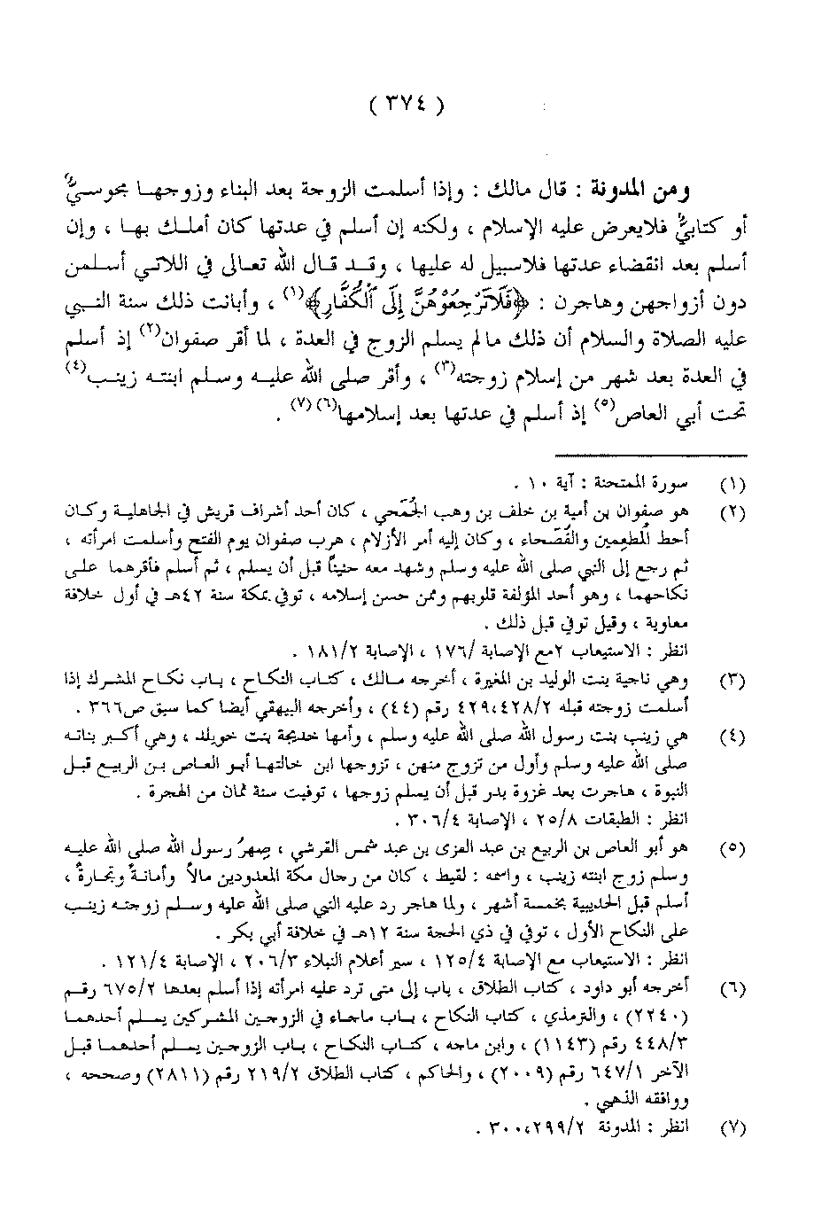 ومن المدونة: قال مالك: وإذا أسلمت الزوجة بعد البناء وزوجها مجوسي أو كتابي فلا يعرض عليه الإسلام، ولكنه إن أسلم في عدتها كان أملك بها، وإن أسلم بعد انقضاء عدتها فلا سبيل له عليها، وقد قال الله تعالى في اللاتي أسلمن دون أزواجهن وهاجرن: {فَلَا تَرْجِعُوهُنَّ إِلَى الْكُفَّار} [الممتحنة:10]، وأبانت ذلك سنة النبي عليه الصلاة والسلام أن ذلك مالم يسلم الزوج في العدة، لما أقر صفوان إذ أسلم في العدة بعد شهر من إسلام زوجته، وأقر صلى الله عليه وسلم ابنته زينب تحت أبي العاص إذ أسلم في عدتها بعد إسلامها.