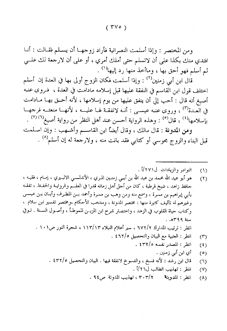 قال ابن زمنين: وإذا أسلمت فكان الزوج أولى بها في العدة إن أسلم اختلف قول ابن القاسم في النفقة عليها قبل إسلامه مادامت في العدة، فروى عنه أصبغ أنه قال: أحب إلي أن ينفق عليها من يوم إسلامها، لأنه أحق بها مادامت في العدة، وروى عنه عيسى: أنه لا نفقة لها عليه، لأنها منعته فرجها بإسلامها، قال: وهذه الرواية أحسن عند أهل النظر من رواية أصبغ.