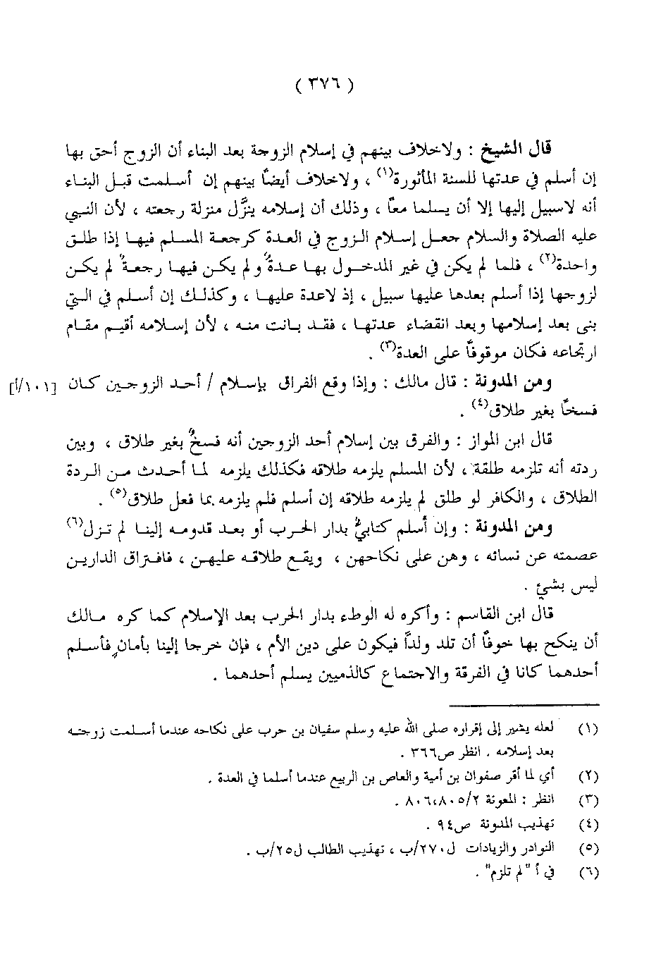 قال الشيخ: ولا خلاف بينهم في إسلام الزوجة بعد البناء أن الزوج أحق بها إن أسلم في عدتها للسنة المأثورة، ولا خلاف أيضاً بينهم إن أسلمت قبل البناء أنه لا سبيل إليها إلا أن يسلما معاً، وذلك أن إسلامه ينزل منزل رجعته، لأن النبي عليه الصلاة والسلام جعل إسلام الزوج في العدة كرجعة المسلم فيها إذا طلق واحدة، فلما لم يكن في غي المدخول بها عدة ولم يكن فيها رجعة لم يكن لزوجها إذا أسلم بعدها عليها سبيل، إذ لا عدة عليها، وكذلك إن أسلم في التي بنى بعد إسلامها وبعد انقضاء عدتها، فقد بانت منه، لأن إسلامه أقيم مقام ارتجاعه فكان موقوفاً على العدة.