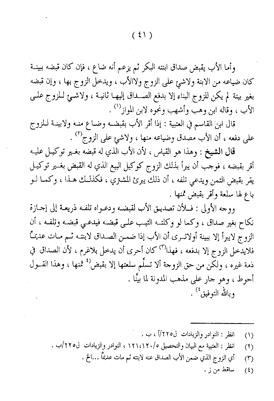 ووجه الأولى: فلأن تصديق الأب لقبضه ودعواه تلفه ذريعة إلى إجازة نكاح بغير صداق، وكما لو وكلته الثيب على قبضه فيدعي قبضه وتلفه، أن الزوج لا يبرأ إلا ببينة أو لا ترى أن الأب إذا صمن الصداق لابنته ثم مات عديمًا فلا يدخل الزوج إلا بدفعه، فهذا كان أحرى أن يدخل بلا غرم، لأن الصداق في ذمة غيره، ولكن من حق الزوجة ألا تسلَّم سلعتها إلا بقبض ثمنها، وهذا القول أحوط، وهو جار على مذهب المدونة لما بينَّا.